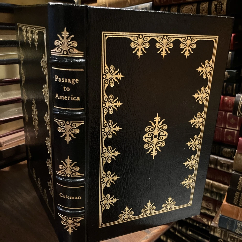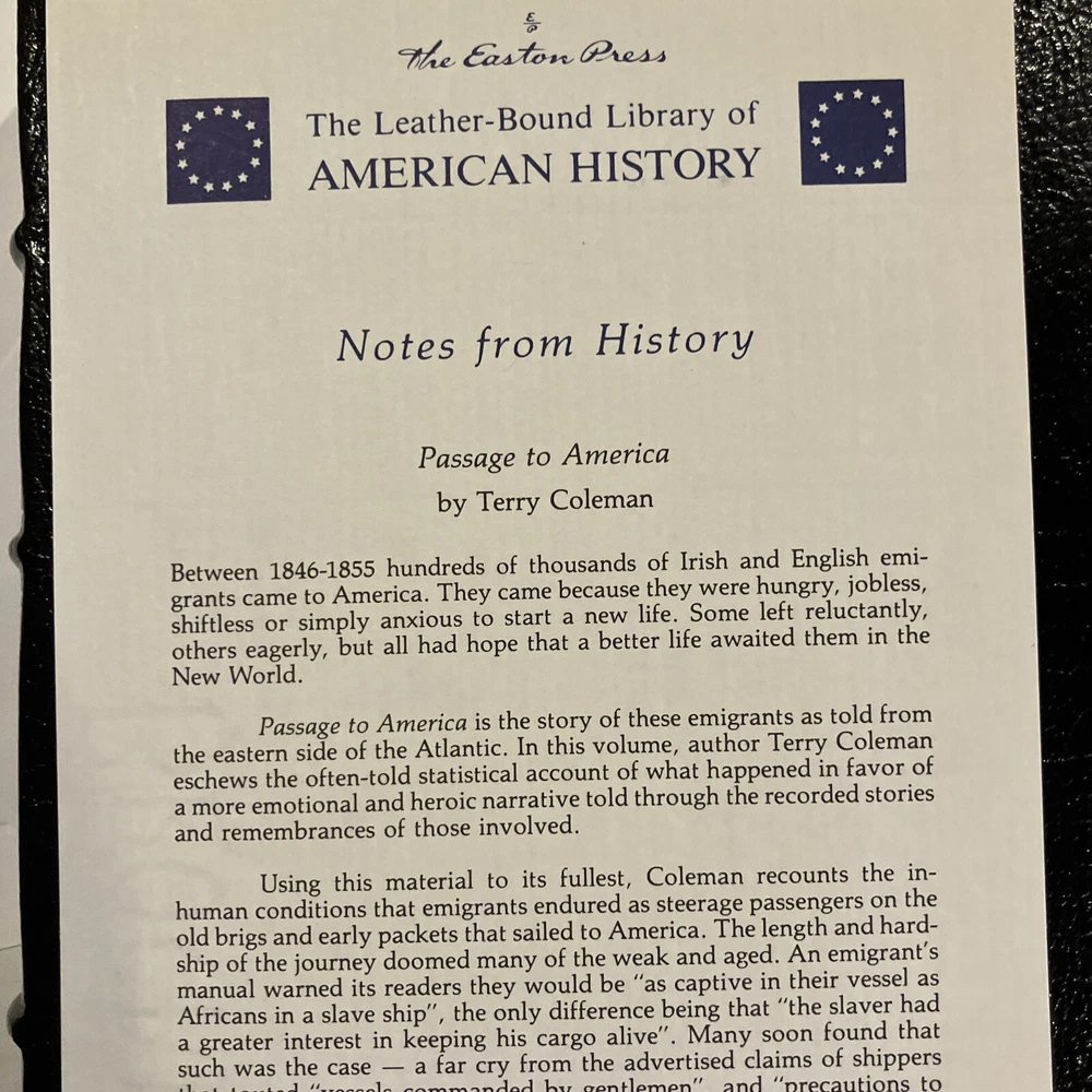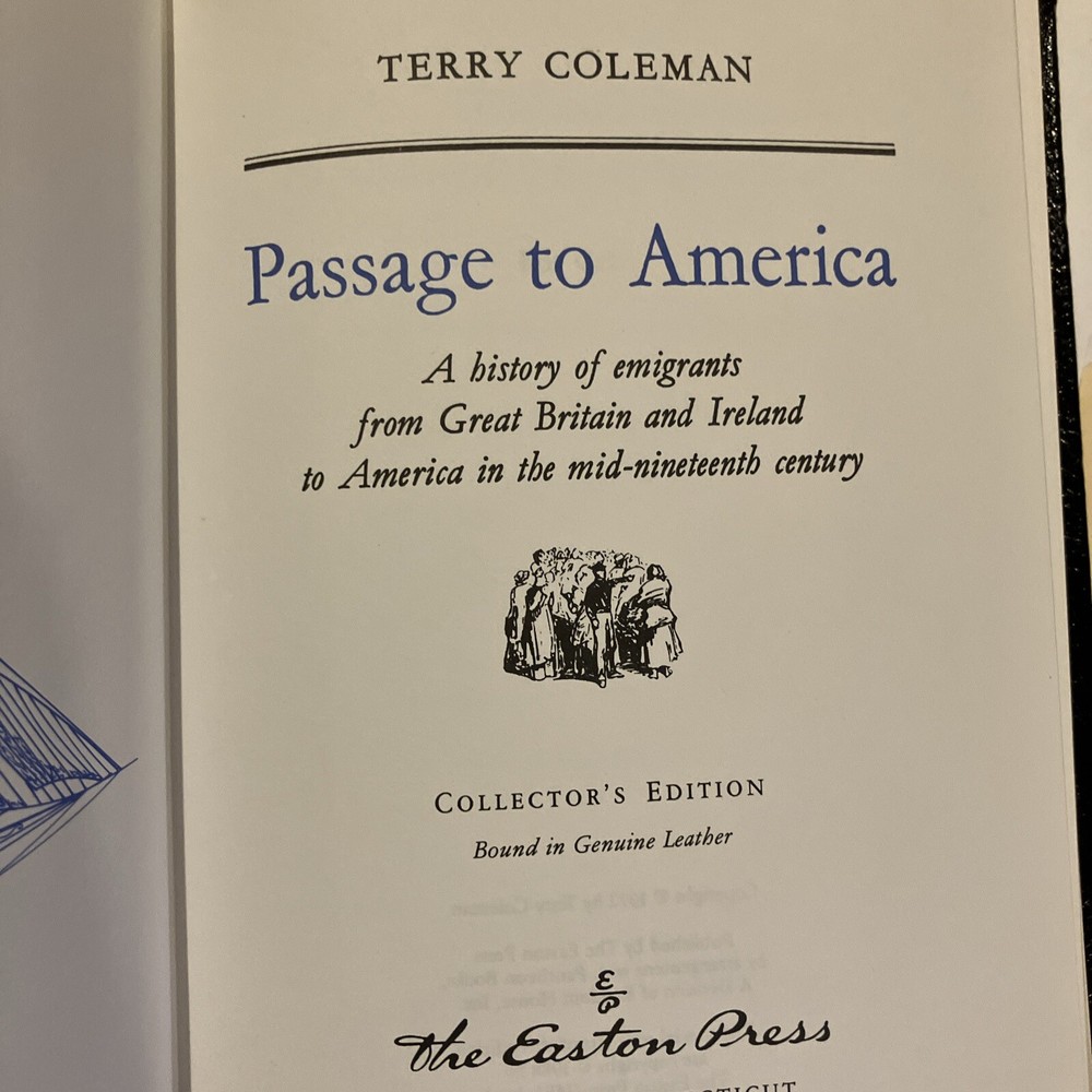 Easton Press leather edition of Terry Coleman's "Passage to America: A History of Emigrants From Great Britain and Ireland to America in the Mid-Nineteenth Century," a COLLECTOR'S edition, one of the LIBRARY OF AMERICAN HISTORY series, Illustrated with Period Photographs, published in 1988. Bound in hunter green leather, the book has decorative paper end leaves, satin book marker, acid-free paper, Symth-sewn binding, hubbed spine, gold gilding on three edges---in near FINE condition —except for a blank attached bookplate on second blank page. COLLECTOR'S NOTES is included. Terry Coleman is a distinguished British journalist and historian. He has reported from eighty countries as a foreign correspondent and interviewed eight British prime ministers from Harold Macmillan to Tony Blair. In 1988, he was named Journalist of the Year. Between 1846-1855, more than two million men, women and children abandoned the British Isles. Whole families and groups of families emigrated together. The average number was 500-700 passengers on a steamer of 800 tons. In 1847, It is estimated that one in six of all who sailed died. These ten years saw by far the greatest emigration from the U.K. to America. The Irish were "shovelled out" by absentee landlords and famine; the English went west to escape poverty and slums. Sea-sick, homesick, herded like cattle, dying like flies, they poured across the Atlantic from Liverpool to New York. They were swindled, robbed, insulted, sexually abused, and terrorized at every stage. Making brilliant use of original diaries and letters, newspapers and prints, Coleman gives us an intensely vivid account of this heroic and historic exodus. An emigrant's manual warned its readers they would be "as captive in their vessels as Africans in a slave ship," the only difference being that "the slaver had a greater interest in keeping his cargo alive." Hundreds of poor people, from the 'driveling' idiot of ninety to the babe just born, were huddled together without light, without air, wallowing in filth and breathing a fetid atmosphere, sick in body, dispirited in heart, living without food or medicine, many dying without the voice of spiritual consolation. Government control over these unscrupulous shipping companies was negligible. By the mid-nineteenth century, it was big business, with plenty of cold-hearted advocates. Upon arrival some took to America immediately, and America to them. Young ANDREW CARNEGIE was one. At 13, he came to New York and soon started as a messenger boy for $2.50 a week. Fifty years later, he was the owner of an iron-and-steel combine that dominated American industry. In the Foreword, Coleman wrote: "This book does not set out to be a history of emigration. It is the story of emigrants---who they were, and why they left, and how and what happened to them." 317 pages, including Sources, Bibliography, Appendices, Occupations of Emigrant to the U.S. in 1852, and an index. I offer combined shipping.