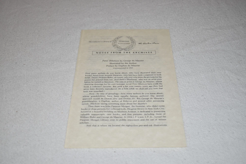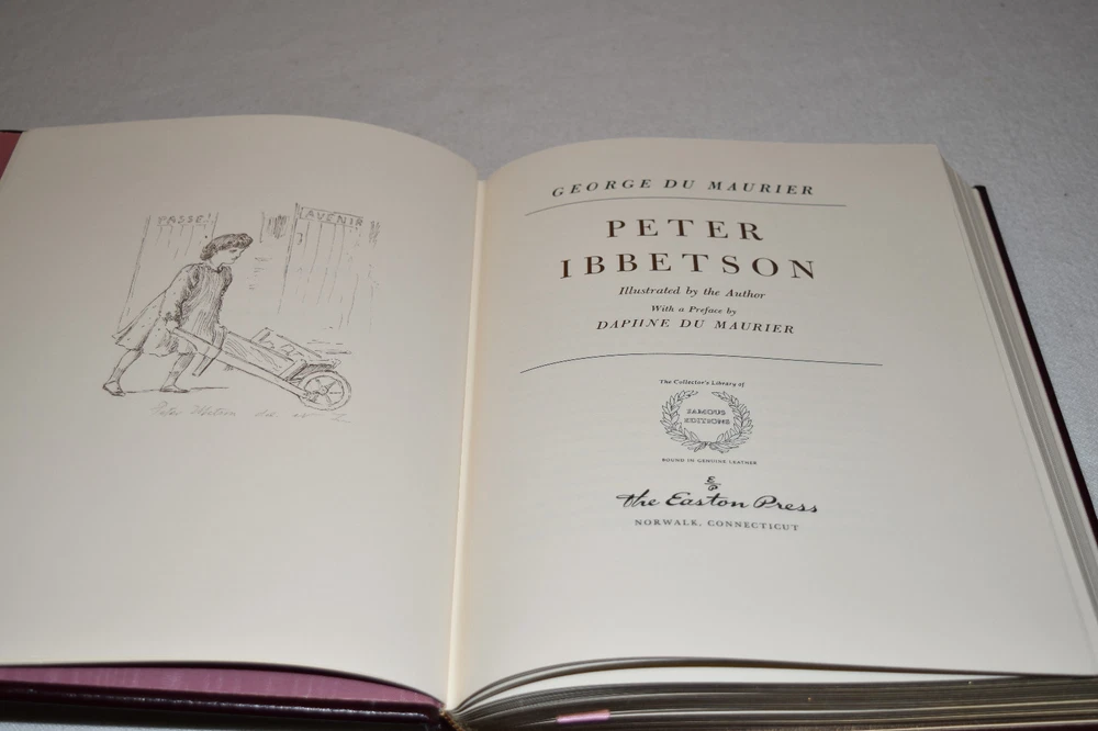 From the Easton Press Famous Editions Collection... Peter Ibbetson by George Du Maurier Illustrated by The Author Introduced by Daphne Du Maurier Copyright 1963 by The Easton Press Bound in Premium Full Leather This volume contains all of the classic Easton Press trimmings: Premium Leather Silk Moire Endleaves Distinctive Cover Design Hubbed Spine, Acccented in Real 22KT Gold Satin Ribbon Page Marker Gilded Page Edges Long-lasting, High Quality Acid-neutral Paper Smyth-sewn Pages for Strength and Durability Beautiful Illustrations A very scarce title in any condition, this volume is in Mint and Unread condition! The front and back covers are both in near perfect condition and the gilded page edges show hardly any wear (see pictures). There are no markings, bookplates, or other signs of prior ownership in this book . This book is part of The Famous Editions Collection series published by Easton Press. It comes complete with Collector's Notes and would be a beautiful addition to your Easton Press collection. Overall, this copy is a grade collector's book. This book is very elusive in this superior condition, as only a limited number of them were ever published, so now is the time to act. Hopefully you can add this book to your collection and enjoy it in the years to come... Please Email Me With Any Questions You Might Have! Shipping Info: Buyer to Pay Shipping & Handling International Bidders Pay Extra Shipping Good luck and happy bidding!