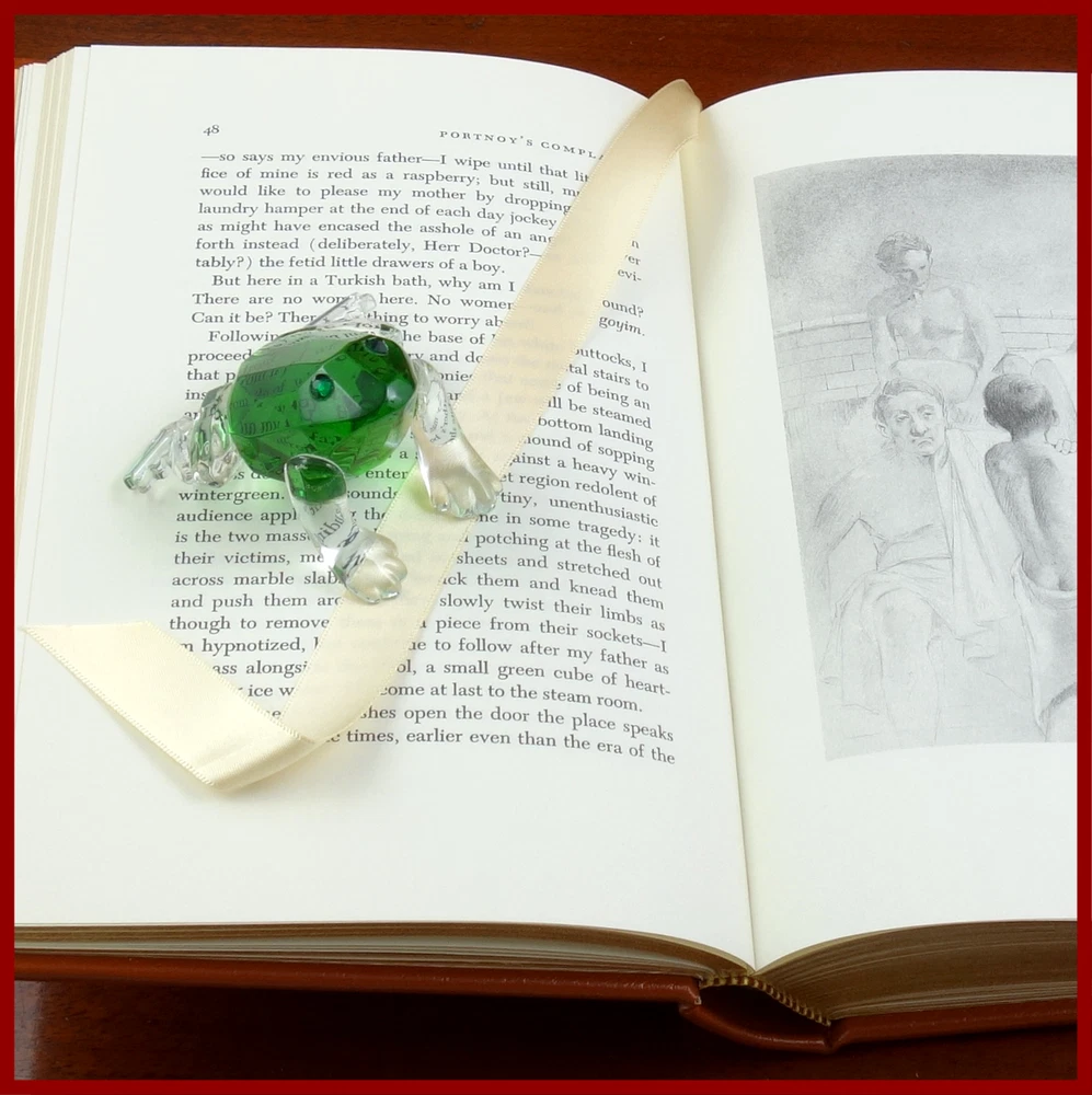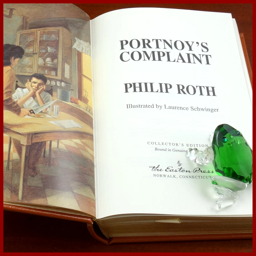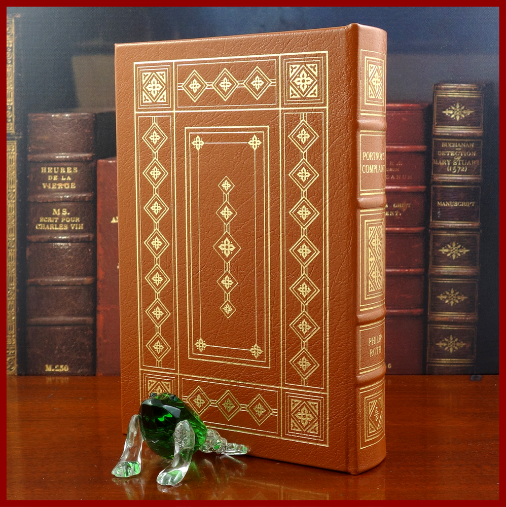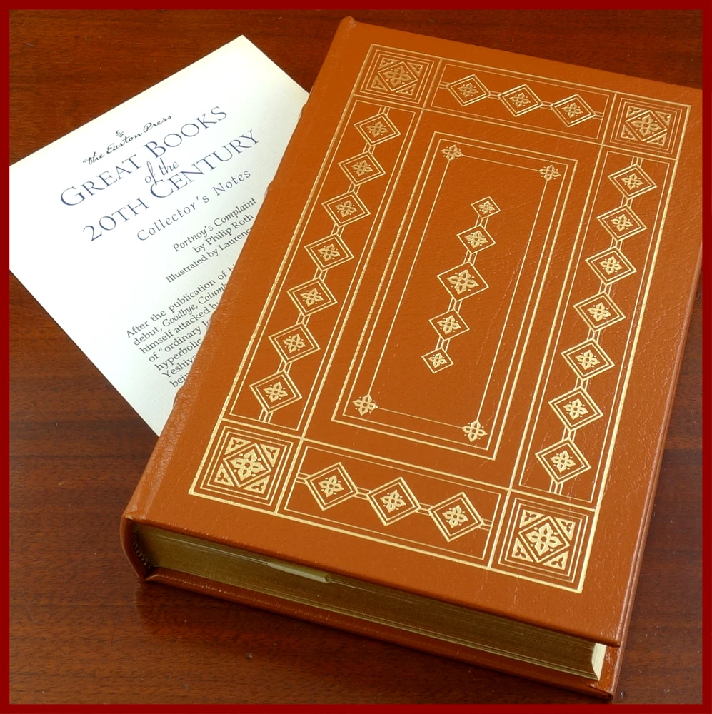 This text was featured in the Easton Press series Great Books of the 20th Century . Published in 1999, bound in handsome Tan leather, and delightfully illustrated by Laurence Schwinger, this edition would be a worthy addendum to your collectible books library. Specifics of this series from the Easton Press website: * Fully and tightly bound in genuine leather * 22kt gold accents deeply inlaid on the "hubbed" spine.* * Heavy duty binding boards... . * Superbly printed on acid-neutral paper... . * Sewn pages – not just glued like ordinary books. * ...moiré endpages and a satin-ribbon page marker. * Gilded page ends. ******************************************************************************************************************* "Pulitzer award-winning author Philip Roth’s iconic and sensational novel about sex, psychoanalysis and growing up Portnoy's Complaint n. [after Alexander Portnoy (1933-)]:A disorder in which strongly-felt ethical and altruistic impulses are perpetually warring with extreme sexual longings, often of a perverse nature. Celebrating its fiftieth anniversary in 2019, Portnoy’s Complaint, arguably Philip Roth’s best-known novel, tells the tale of young Jewish lawyer Alexander Portnoy and his scandalous sexual confessions to his psychiatrist. As narrated by Portnoy, he takes the reader on a journey through his childhood to adolescence to present day while articulating his sexual desire, frustration and neurosis in shockingly candid ways. Hysterically funny and daringly intimate, Portnoy’s Complaint was an immediate bestseller upon its publication and elevated Roth to an international literary celebrity. ‘The most outrageously funny book about sex written...Portnoy's Complaint is still a masterclass in how to get beneath the skin of sexuality. Has any other novel managed it quite so well?’ — Guardian" ////////////////////////////////////////////////////////////////////////////////////////////////////////////////////////////////////////////////////////////// Philip Milton Roth (March 19, 1933 – May 22, 2018) was an American novelist and short-story writer. Roth's fiction—often set in his birthplace of Newark, New Jersey—is known for its intensely autobiographical character, for philosophically and formally blurring the distinction between reality and fiction, for its "sensual, ingenious style" and for its provocative explorations of American identity. He first gained attention with the 1959 short story collection Goodbye, Columbus, which won the U.S. National Book Award for Fiction. Ten years later, he published the bestseller Portnoy's Complaint . Nathan Zuckerman, Roth's literary alter ego, narrates several of his books. A fictionalized Philip Roth narrates some of his others, such as the alternate history The Plot Against America. Roth was one of the most honored American writers of his generation. He received the National Book Critics Circle award for The Counterlife, the PEN/Faulkner Award for Operation Shylock, The Human Stain, and Everyman, a second National Book Award for Sabbath's Theater, and the Pulitzer Prize for American Pastoral. In 2005, the Library of America began publishing his complete works, making him the second author so anthologized while still living, after Eudora Welty.[6] Harold Bloom named him one of the four greatest American novelists of his day, along with Cormac McCarthy, Thomas Pynchon, and Don DeLillo. In 2001, Roth received the inaugural Franz Kafka Prize in Prague. The above text was taken from, respectively, Random House publishing and Wikipedia. [Roth, Philip. Portnoy's Complaint. United Kingdom: Random House, 2010. ]