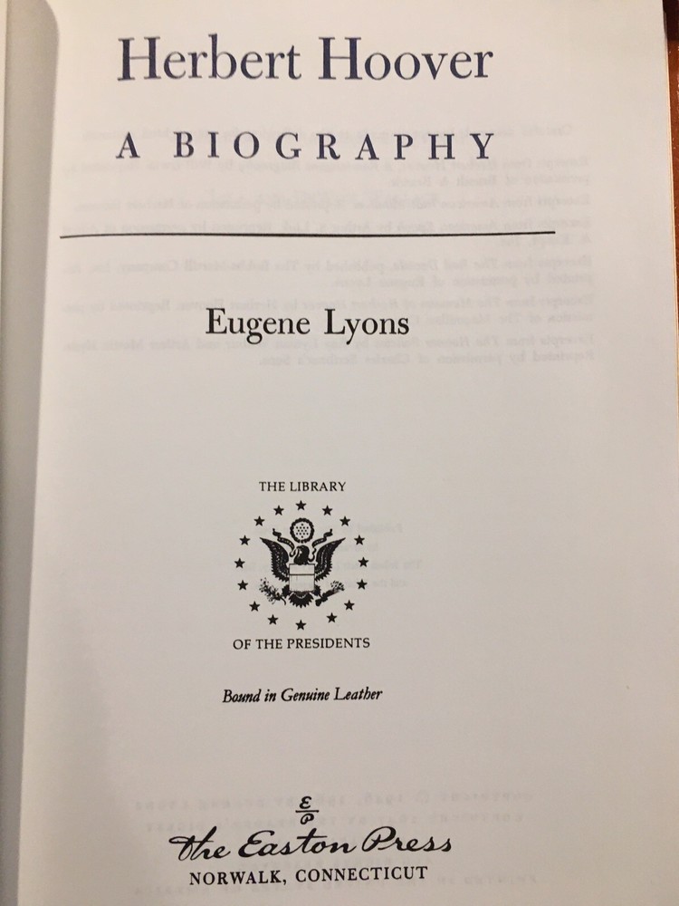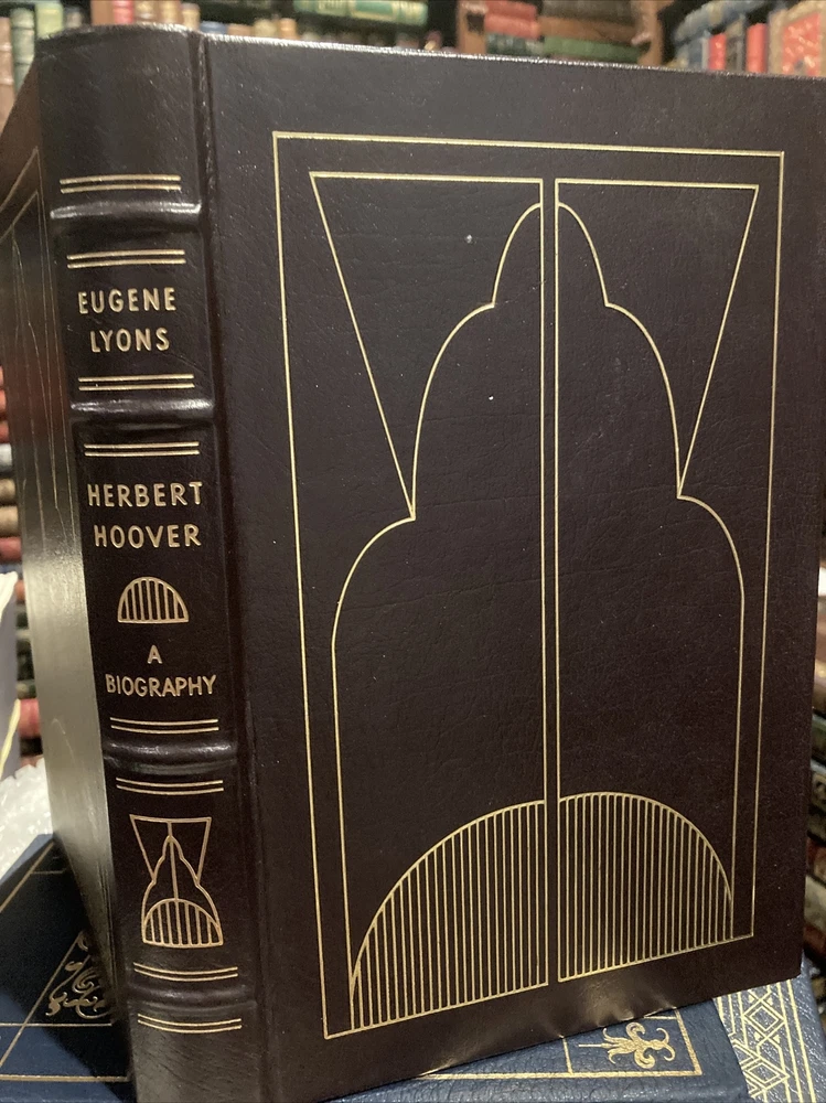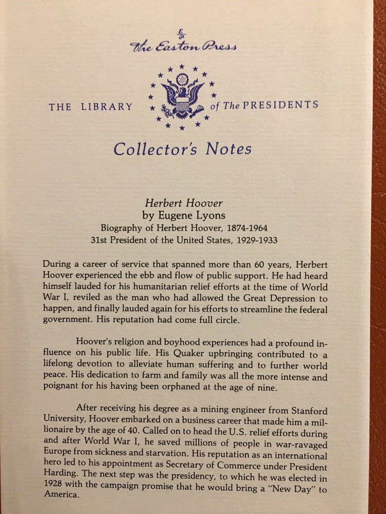 Easton Press leather edition of Eugene Lyons' "Herbert Hoover: A Biography," a COLLECTOR'S edition, one of the LIBRARY OF THE PRESIDENTS series, published in 1964. Bound in burgundy leather, the book has paper end leaves, hubbed spine, satin book marker, acid-free paper, Symth-sewn binding, gold gilding on three edges---in near FINE condition. COLLECTOR'S NOTES is included. Herbert Hoover, who lived from 1874-1964, was the 31st President of the U.S., 1929-1933. Hoover's religion and boyhood experiences had a profound influence on his public life. His Quaker upbringing contributed to a lifelong devotion to alleviate human suffering and to further world peace. Hoover graduated from STANFORD UNIVERSITY with a mining degree and and made himself a millionaire by the age of 40. Called on to head the U.S. relief efforts during and after WW I, he saved millions of people in war-ravaged Europe from sickness and starvation. Hoover was appointed Secretary of Commerce under President Harding and was elected President of the U.S. in 1928, promising a "New Day," but American plunged into the Great Depression just seven months after Hoover took the oath of office. His native calm and seeming reluctance to invoke federal powers made him seem aloof and unfeeling to the suffering around him. Republican Hoover was swept out of office by Democrat FRANKLIN D. ROOSEVELT in a landslide election of 1932. Hoover had promised a "chicken in every pot," but the Democrats retorted: "there ain't no chicken and there ain't no pot." 444 pages. I offer Combined shipping.
