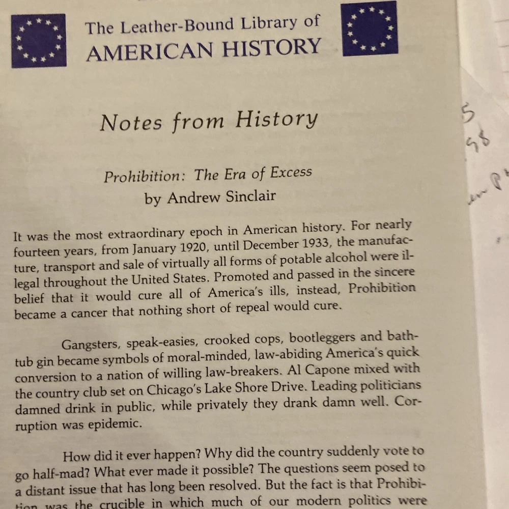 Easton Press leather edition of Andrew Sinclair's "The Era of Prohibition," one of the LIBRARY OF AMERICAN HISTORY series, published in 1986. Bound in hunter green leather, the book has paper end leaves, hubbed spine, satin book marker, acid-free paper, gold gilt on three edges---in near FINE condition---except for a 'crimped book press' on title pages. COLLECTOR'S NOTES is included. Andrew Annandale Sinclair, who lived from 1935-2019, was a British novelist, historian, biographer, "a writer of extraordinary fluency and copiousness." Born in Oxford, Sinclair was educated at ETON COLLEGE, and TRINITY COLLEGE, CAMBRIDGE where he studied history and received his BA and Ph.D. degrees. From 1959-61, he was a Harkness Fellow at HARVARD. For fourteen years, from January 1920 until December 1933, the manufacture, transport, and sale of virtually all forms of "potable alcohol" were illegal throughout the United States. Promoted and passed in the sincere belief that it would cure all of America's ills, instead, Prohibition became a cancer that nothing short of repeal would cure. Gangsters, speak-easies, crooked cops, bootleggers and bathtub gin became symbols of moral-minded, law-abiding America's quick conversion to a nation of willing law-breakers. AL CAPONE mixed with the country club set on Chicago's Lake-Shore Drive. Leading politicians damned drink in public, while privately they drank damn well. Corruption was epidemic. The Prohibitionist movement exploded when the 1910 census revealed that 40% of all Americans lived in cities. The cause became a crusade. Churches invaded the political arena as they never had before. No politician could favor alcohol and be elected. When Prohibition was repealed in 1933, in the midst of the Great Depression, America was too preoccupied with survival to even remember the passionate debate which had inflamed it for decades. The Women's Christian Temperance Union put pressure on Senator Harding in 1924---but Harding drank whiskey and played poker while serving in the U.S. Senate----along with a host of other Senators. Calvin Coolidge wrote: "In public life it is sometimes necessary in order to appear really natural to be actually artificial." Coolidge did as little as possible and therefore made few mistakes. The "drys" had early set up methods of swinging newspaper to their side in the debates. Sinclair wrote: "Resistance to the drys was contagious. Once their bandwagon to victory began to stall, the voices of the wets grew bolder. And once the wets had copied the methods of the Anti-Saloon League, they too had a club to brandish in the faces of members of Congress." Sinclair concluded that "Prohibition sought to regulate human morality and human habits. But the trouble with moral legislation is that is does not keep to the limits set by reasonable and respectable men. Obsessed by their impossible mission, the drys forgot their duty of mercy and charity towards society in the zealous pursuit of the drinking sinner." 480 pages, including an index. I offer combined shipping.
