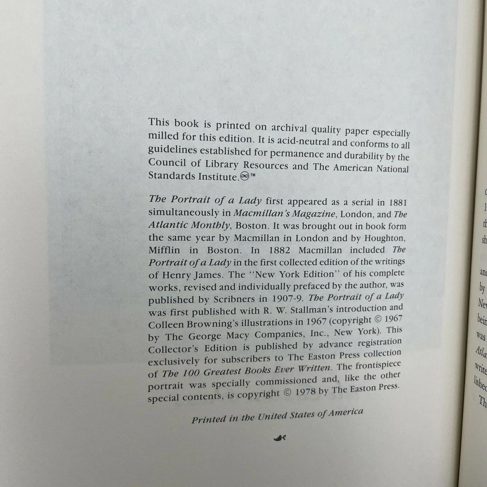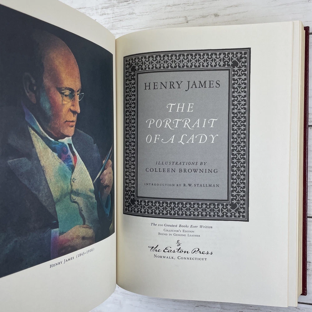 The Portrait of a Lady written by Henry James illustrated by Colleen Browning Easton Press The 100 Greatest Books Ever Written Collector's Edition Bound in Genuine Leather Norwalk, Connecticut 1978 **Shipping is automatically combined on most orders within the US. Add multiple items to your cart prior to checkout to see the reduced shipping charges.**