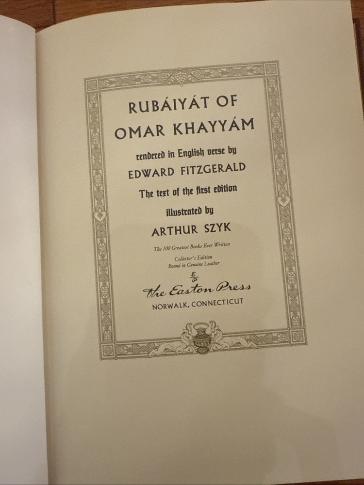 The Easton Press Rubaiyat of Omar Khayyam 100 Greatest Series is a luxurious leather-bound edition of the famous poetry of Omar Khayyam, published by Easton Press in the United States. This collectible book features the timeless verses of the renowned poet, presented in English language with a classic design that showcases the beauty and elegance of the text. Perfect for book collectors and enthusiasts of classic literature, this limited edition piece is a valuable addition to any library or collection.