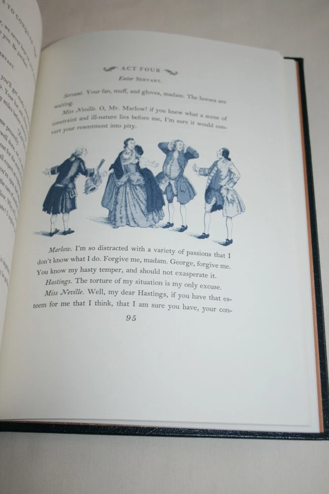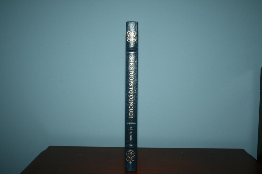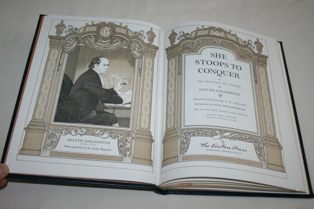 From the Easton Press 100 Greatest Books Ever Written Collection... She Stoops to Conquer Or The Mistakes of a Night by Oliver Goldsmith Illustrated by T. M. Cleland Collector's Edition Copyright 1978 by The Easton Press Bound in Premium Full Leather This volume contains all of the classic Easton Press trimmings: Premium Leather Silk Moire Endleaves Distinctive Cover Design Hubbed Spine, Accented in Real 22KT Gold Satin Ribbon Page Marker Gilded Page Edges Long-lasting, High Quality Acid-neutral Paper Smyth-sewn Pages for Strength and Durability Beautiful Illustrations A very scarce title in any condition, this 1978 Easton Press First Edition is in Absolute Mint and Unread condition! The front and back covers are both in Perfect condition and the gilded page edges show no wear at all! There is NO attached bookplate nor any other signs of previous ownership . This book is part of the 100 Greatest Books Ever Written Collection published by Easton Press and would be a beautiful addition to your Easton Press collection. Overall, this copy is a grade collector's book. This book is very elusive in this superior condition, as only a limited number of them were ever published, so now is the time to act. Hopefully you can add this book to your collection and enjoy it in the years to come... Please Email Me With Any Questions You Might Have! Shipping Info: Buyer to Pay Shipping and Handling International Bidders Pay Extra Shipping Seller Not Responsible For Uninsured Items Lost or Damaged in Mail Forms of Payment Accepted: Paypal Good luck and happy bidding! Powered by eBay Turbo Lister The free listing tool. List your items fast and easy and manage your active items.