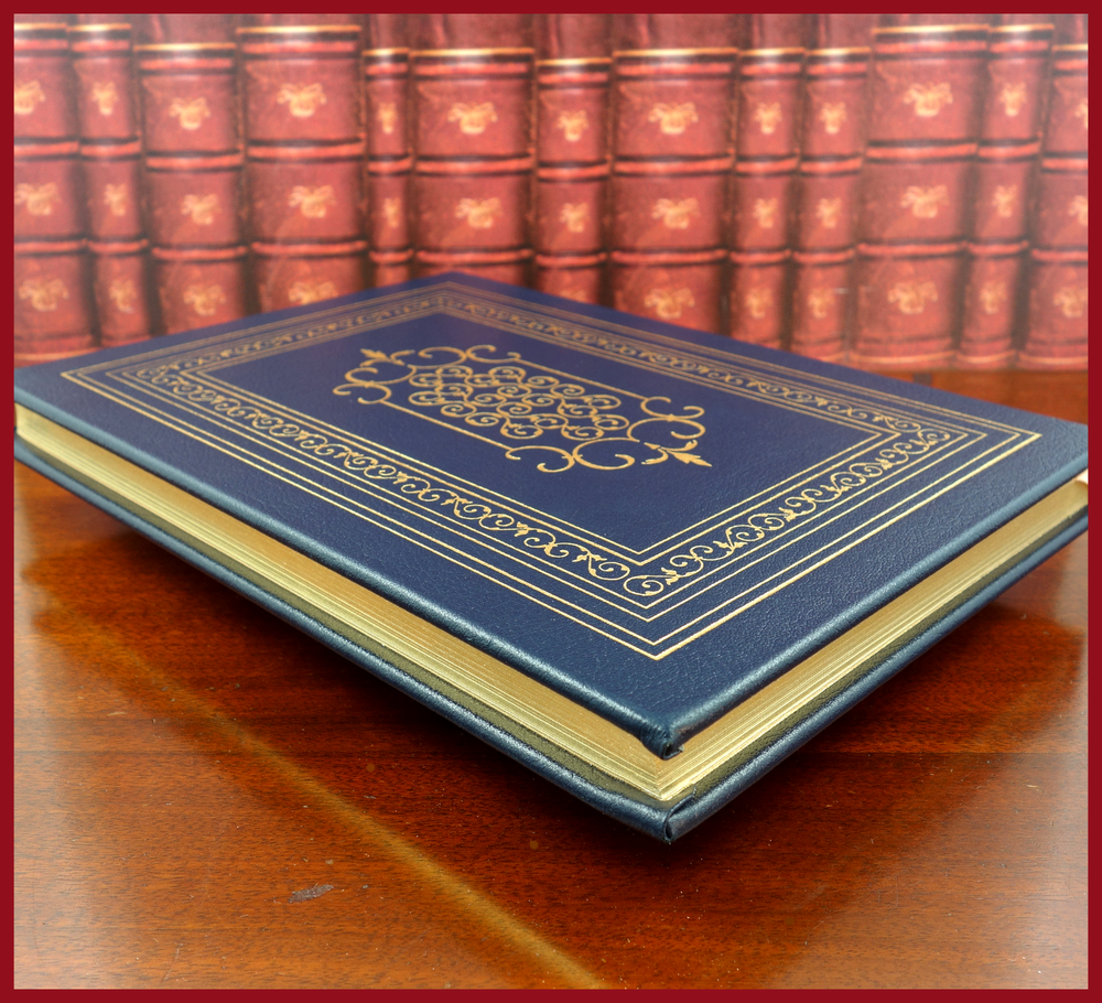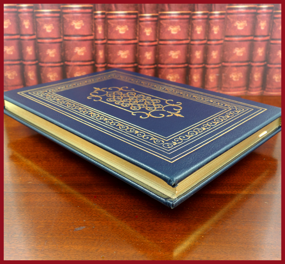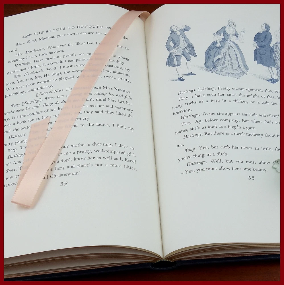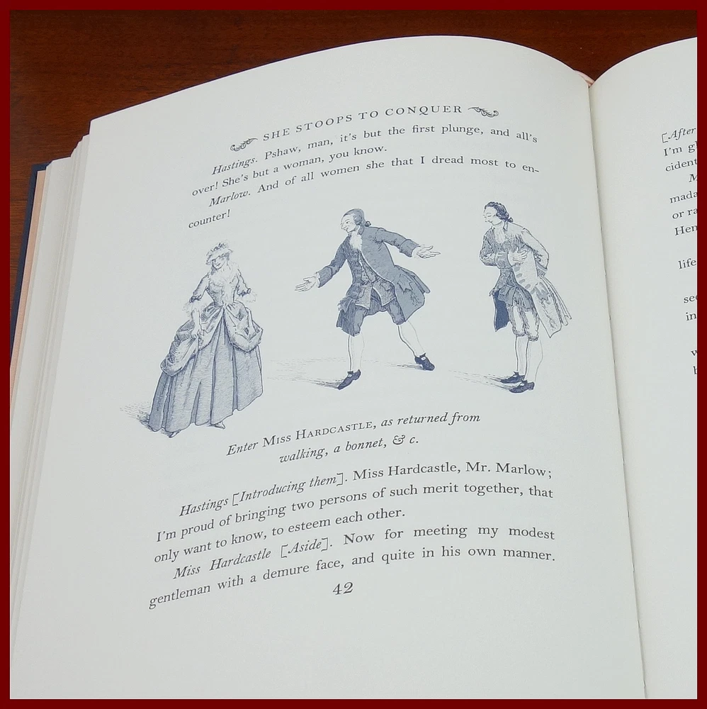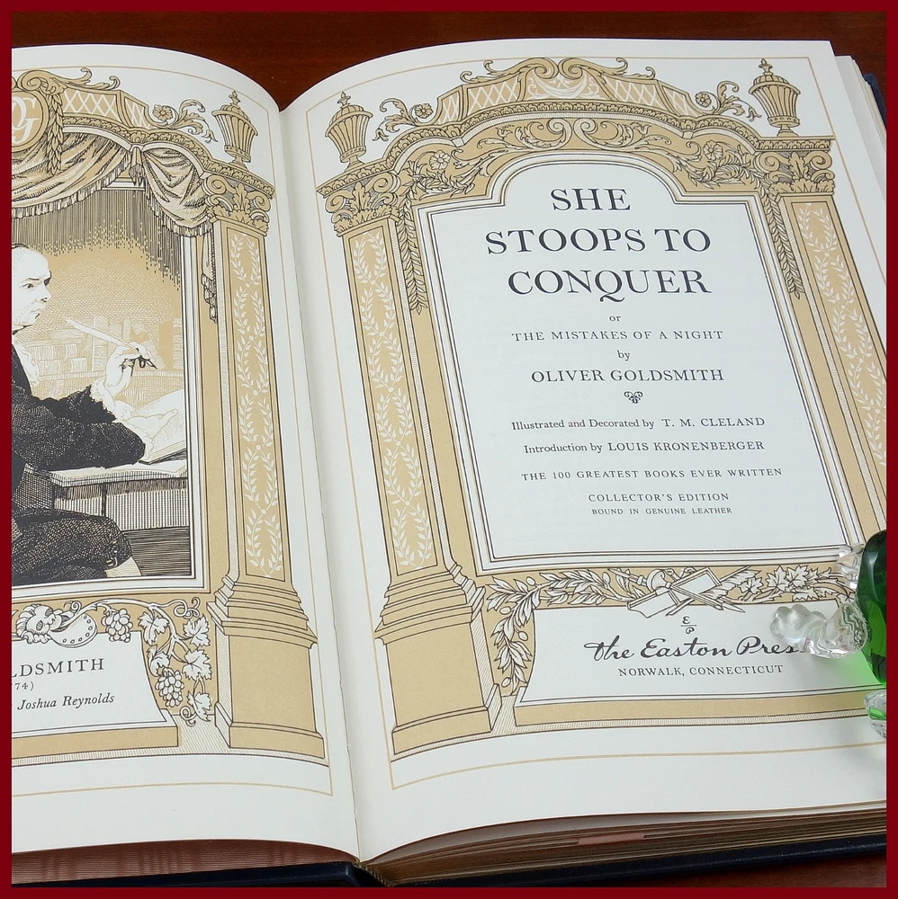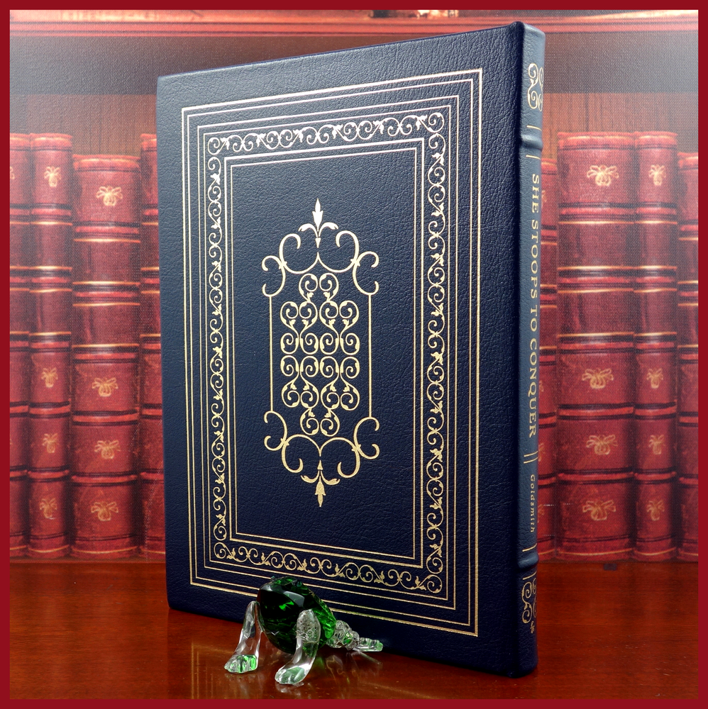 We recently purchased a large collection of Easton Press books to be listed in the coming weeks. Stay tuned for the chance to pick up some collectible titles. This text is included in the Easton Press series The 100 Greatest Books Ever Written . Published in 1978, bound in handsome Navy Blue leather, and beautifully illustrated by T. M. Cleland, this edition would be a worthy addendum to your collectables library. Specifics of this series from the Easton Press website: Fully and tightly bound in genuine leather. 22kt gold accents deeply inlaid on the "hubbed" spine. Heavy duty binding boards... . Superbly printed on acid-neutral paper... . Sewn pages – not just glued like ordinary books. ...moiré endpages and a satin-ribbon page marker. Gilded page ends. ******************************************************************************************************************************** "This charming comedy has delighted audiences for over two centuries. First performed in 1773, it concerns Kate Hardcastle, a young lady who poses as a serving girl to win the heart of a young gentleman too shy to court ladies of his own class. A number of delightful deceits and hilarious turns of plot must be played out before the mating strategies of both Kate Hardcastle and her friend Constance Neville conclude happily. Along the way, there is an abundance of merry mix-ups, racy dialogue and sly satire of the sentimental comedies of Goldsmith's day. The extraordinary humor and humanity with which Goldsmith invested this play have made it one of the most read, performed, and studied of all English comedies." ////////////////////////////////////////////////////////////////////////////////////////////////////////////////////////////////////////////////////////////////////////////// Oliver Goldsmith (10 November 1728 – 4 April 1774) was a well-known Anglo-Irish novelist, playwright, dramatist and poet, noted for his novel The Vicar of Wakefield (1766), his pastoral poem The Deserted Village (1770), and his plays The Good-Natur'd Man (1768) and She Stoops to Conquer (1771, first performed in 1773). He is thought by some to have written the classic children's tale The History of Little Goody Two-Shoes (1765). . . . Goldsmith's friend and contemporary Samuel Johnson greatly admired the play { She Stoops to Conquer }. James Boswell quoted him as saying, "I know of no comedy for many years that has so much exhilarated an audience that it has answered so much the great end of comedy – making an audience merry". The above text was taken from, respectively, Dover Publications (via Google Books) and Wikipedia. [Goldsmith, Oliver. She Stoops to Conquer. United Kingdom: Dover Publications, 1991.]
