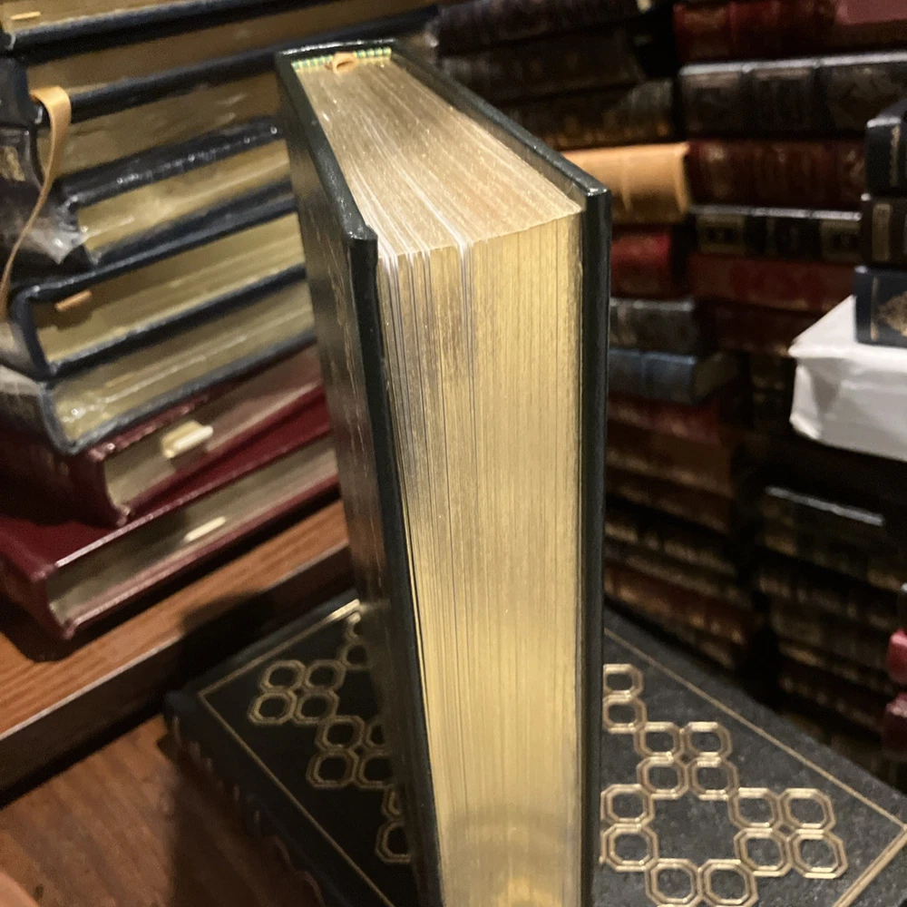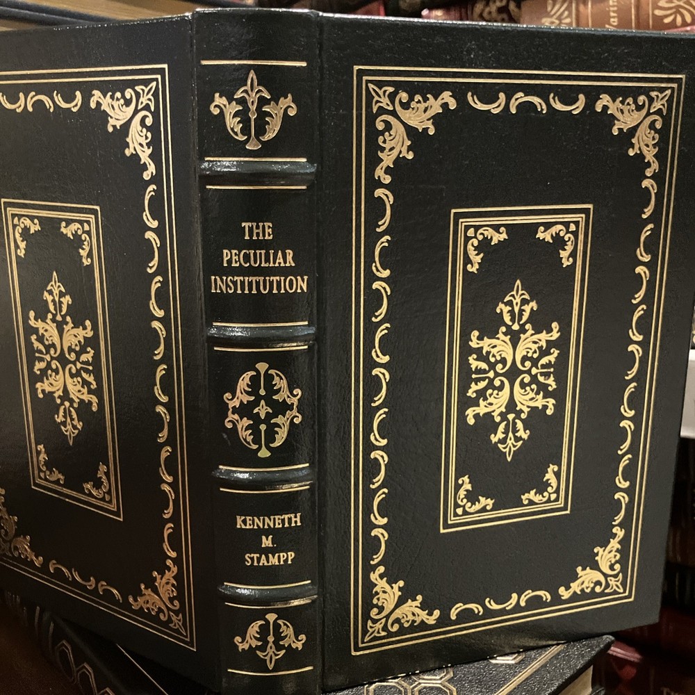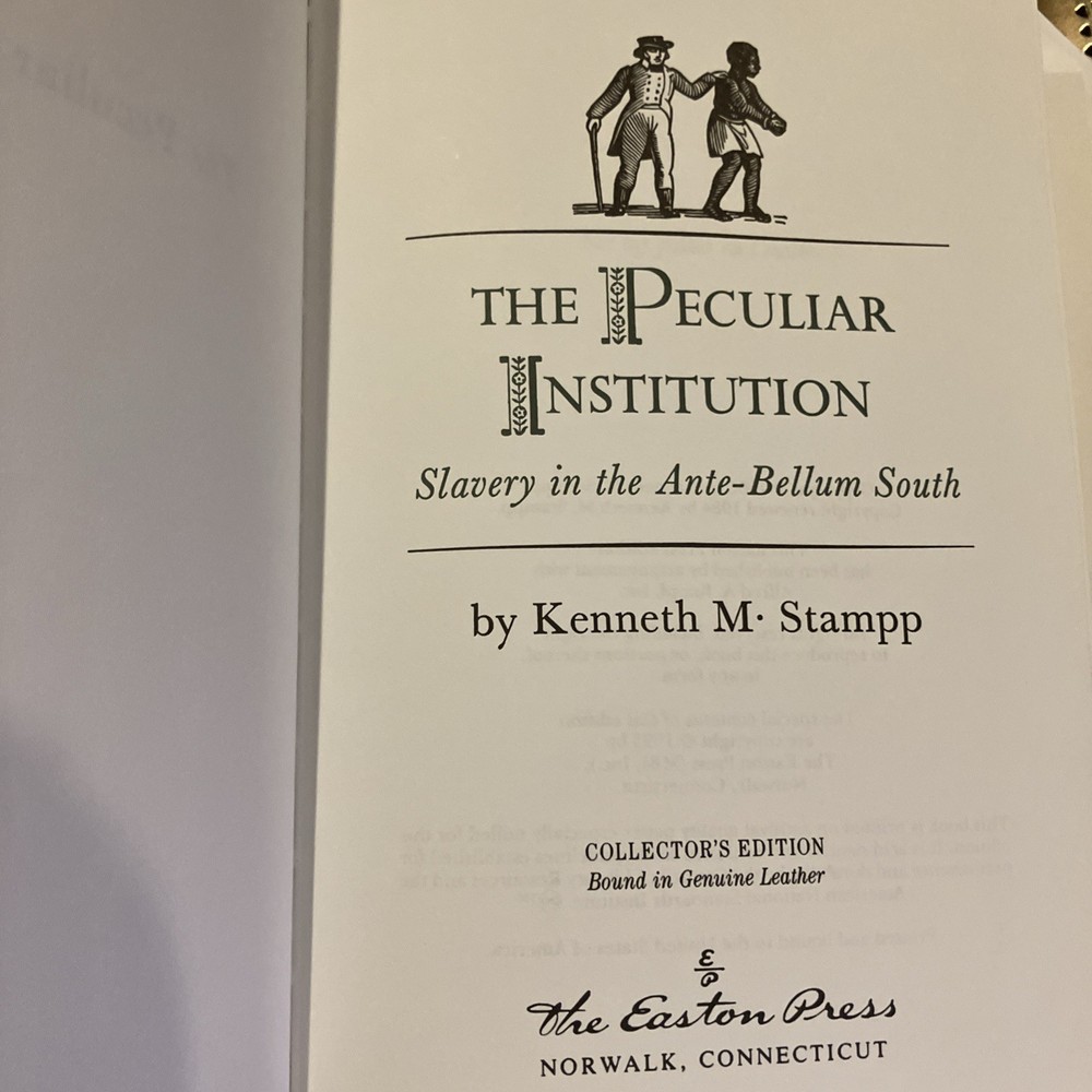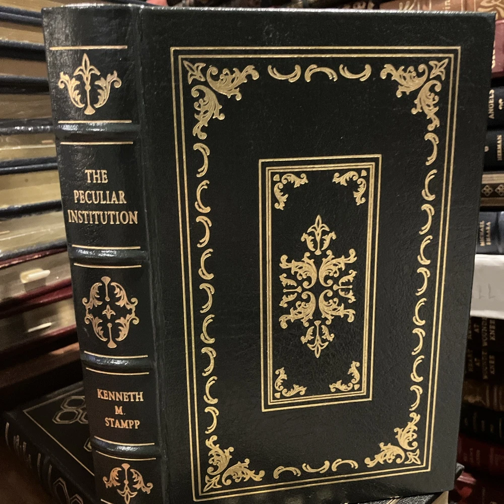 Easton Press leather edition of Kenneth Stamp's "The Peculiar Institution: Slavery in the Ante-Bellum South," a COLLECTOR'S edition, one of the LIBRARY OF AMERICAN HISTORY series, published in 1995. COLLECTOR'S NOTES is included. Bound in hunter green leather, the book has paper end leaves, acid-free paper, satin book marker, hubbed spine, gold gilt on three edges---in FINE condition. Enslavement of black Africans by white European settlers began in North America as early as 1619 and was an accepted and integral part of the emerging American society, particularly in the highly agrarian southern colonies and territories. Despite claims that enslaved people loved their status, escape attempts were frequent and well documented---although the prospect for success was extremely dim. Slaves were intentionally kept illiterate and ignorant of geography and black people were not allowed to blend with the general population. Most of the free states enforced laws protecting a slaveowner's right to reclaim an escaped slave. Some slaves, such as Harriet Tubman and Frederick Douglas became vital members of the absolutist movement, but the majority of escaped slaves were caught and brutally tortured---sometime killed---for their efforts. Slaves were considered property and nothing more. Severe whipping was by far the most popular form of punishment, although branding and mutiliation were not uncommon. Delaware prohibited importations of Africans in 1787; Virginia in 1778; Maryland in 1783; South Carolina in 1787; North Carolina in 1794, and Georgia in 1798. By 1810, the southern slave population had grown to more than a million. The South of 1860 was overwhelmingly rural. Five southern states---North Carolina, Florida, Mississippi, Arkansas, and Texas---did not have a single city with a population of 10,000. New Orleans was the only big American city that was truly southern. The "peculiar institution" was part of othe agrarian civilization. The South's nearly four million slaves were unevenly distributed geographically, but most slaveholders had fewer than a dozen slaves. The planter who owned more than thirty slaves were the ones who achieved maximum efficiently, and those owners generally hired full-time overseers. Urban masters often hired out the husbands or children of their female domestics. Arson was the most common slave "crime," as fire was a favorite means for aggrieved slaves to even the score with their master. The status of a child of mixed Negro and white ancestry depended upon the status of the mother. In 1830, more than thirty-six hundred free Negroes or persons of mixed ancestry owned slaves. Marriages between whites and Negroes or "mulattoes," whether free or unfree, were prohibited. But the color barrier did not prevent miscegenation in the Old South. "How many have fallen before this temptation!" wrote a Virginian. "So many that it has almost ceased to be a temptation to fall!" Many parents traced the moral ruin of their sons "to temptations found in female slaves in their own or neighbor's households." Another Virginian complained that whites in the neighborhood interfered with their slave women. "Cato born of Dinah, but some white chap on the commons, and another Virginian affirmed that one of his slave women had all of her children "by whoredom most of them gotten by white men" at a neighbor's house. Two large slaveowners, Turner and Crocker, acknowledged having slave mistresses. Dr. Kenneth Stamps' research is exhaustive. Stamps, who lived from 1912-2009, was the Distinguished Professor of History at the University of California---Berkley.