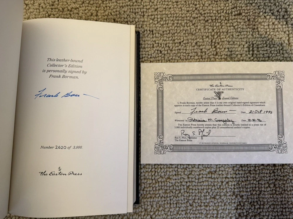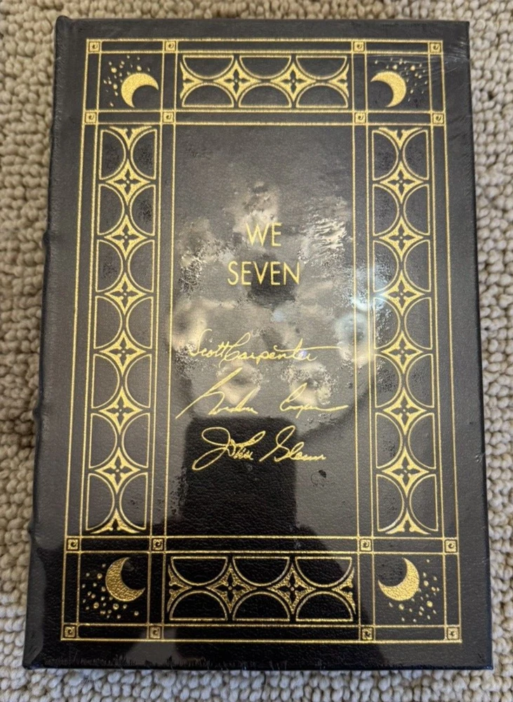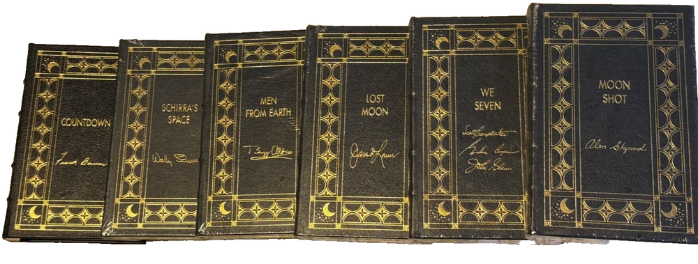 Easton Press Astronaut Series – Excellent Condition (new), Original Packaging This is a matched 6 volume set that was purchased personally by in 1997 or 98. I've carefully stored these volumes since. Five of six (5 of 6) volumes are un-opened and in their original plastic packaging. The opened volume is Frank Borman’s “Countdown”. It has been opened to reveal the included Certificate of Authenticity and Borman’s signature (see pictures). The Borman volume is numbered #2620 of3000 (see pictures) and I expect the unopened volumes to be numbered the same. These men will FOREVER be honored as the FIRST Americans in space. The books are: We Seven (Limited edition signed by Scott Carpenter, Gordon Cooper and John Glenn) Moon Shot (Limited edition signed by Alan Shepard) Lost Moon (Limited edition signed by Jim Lovell) Men From Earth (Limited edition signed by Buzz Aldrin) Schirra's Space (Limited edition signed by Wally Schirra) Countdown (Limited edition signed by Frank Borman) All volumes are in excellent condition. Bound in black leather, these Easton Press books have extensive gilt decoration and are printed on archival quality paper.