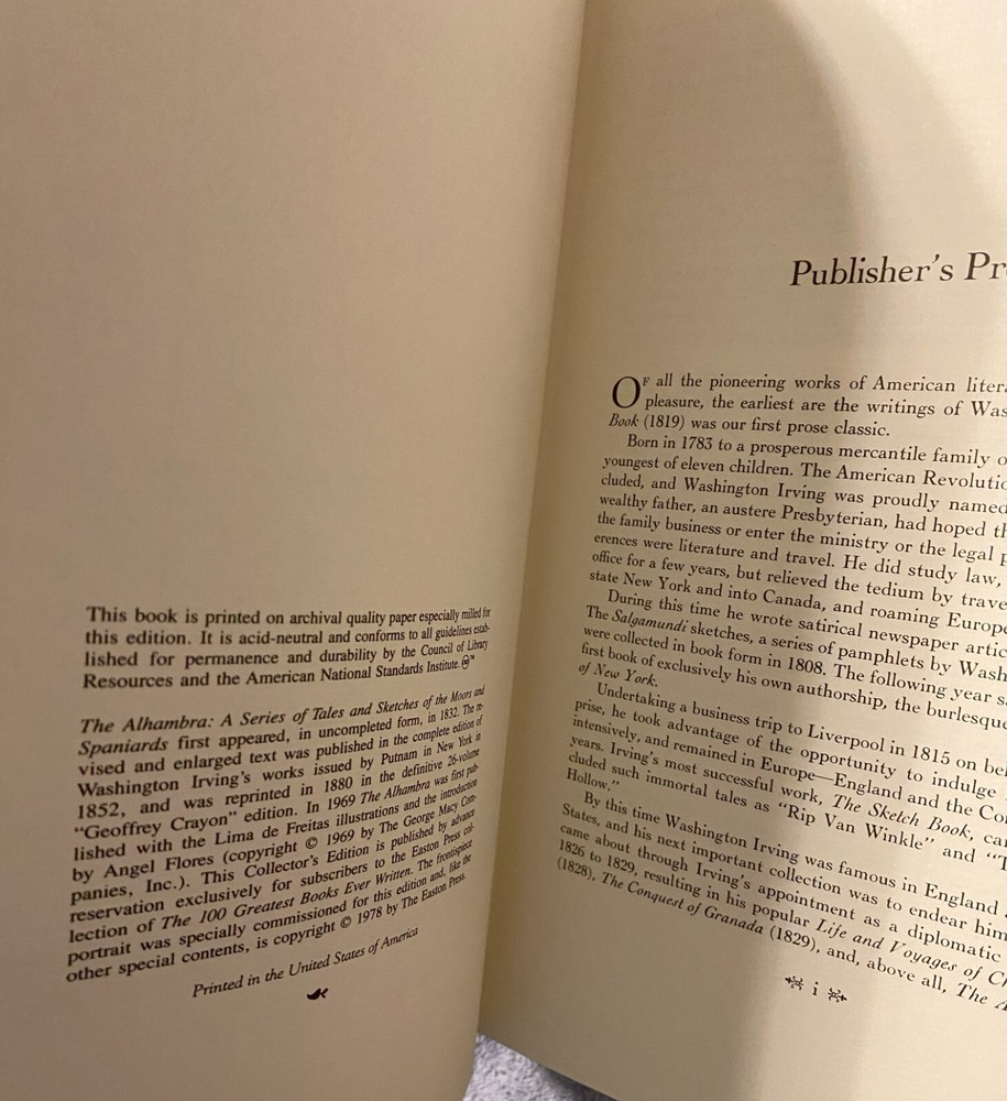 This is a beautifully crafted book from the Easton Press 100 Greatest Series. The Alhambra, written by Washington Irving, features a stunning leather binding and is written in English. The publisher, Easton Press, is well-known for its exceptional book design and quality. This book is perfect for collectors of antiquarian and collectible books, and would make a great addition to any library. The country/region of manufacture for this book is the United States. Don't miss out on the opportunity to own this exquisite piece of literature. Click HERE to check out my other items!