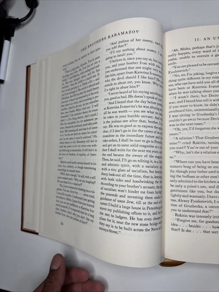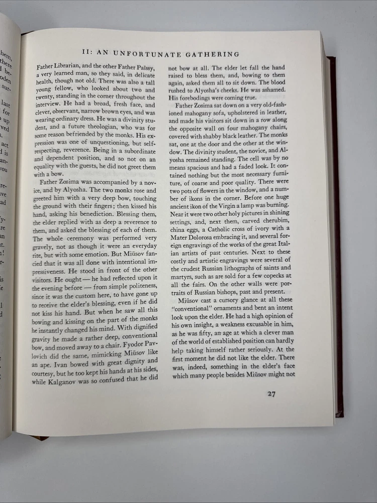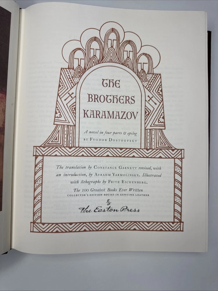PLEASE REVIEW PICTURES BEFORE PURCHASING- book is in excellent condition! This is a rare and highly sought-after collector's edition of "The Brothers Karamazov" by Fyodor Dostoevsky. The book is bound in high-quality leather and features Easton Press's 100 Greatest Series design. The language of the book is English, and it was published in the United States by Easton Press. The book is a classic piece of literature and fiction, perfect for any book collector or literature enthusiast. The author, Fyodor Dostoevsky, is known for his masterful storytelling and profound characters. This book is a must-have for any fan of his work or anyone looking to add a valuable piece to their book collection.