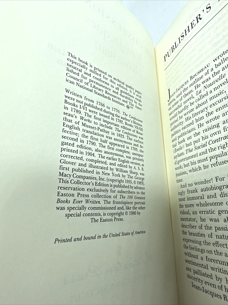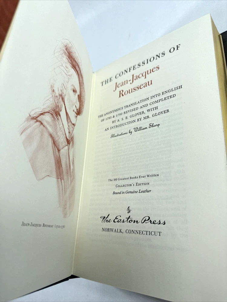 You are buying... Easton Press The Confessions of Jean-Jacques Rousseau 100 Greatest Series CONDITION: Pre Owned/Near Mint VeryGood condition and is free of highlighting, underlining or other markings. ***BUY WITH CONFIDENCE, this seller has excellent reviews and customer service ratings!*** - Books and other media ship USPS Media Mail unless otherwise specified at the time of placing your order. Whenever possible we strive to offer UPS, FedEx and USPS to provide the best possible shipping rates . We offer international shipping via eBay’s international Global Shipping Program (GSP.) Please inquiry with eBay regarding cost and availability. - PAYMENTS: We ONLY accept PayPal - SHIPPING/HANDLING TIME: We ship items within 3 business days of your payment clearing. (Excludes Holidays and Weekends.) - RETURNS: No returns on this item(s) - FEEDBACK: Our goal is to provide you exceptional customer service and to earn your 5 Star Feedback on every item. If you are happy with your purchase and experience please leave a 5 star review! If you have any issues with your purchase, please do not hesitate to contact us before leaving any feedback through eBay’s message service to resolve the issue.
