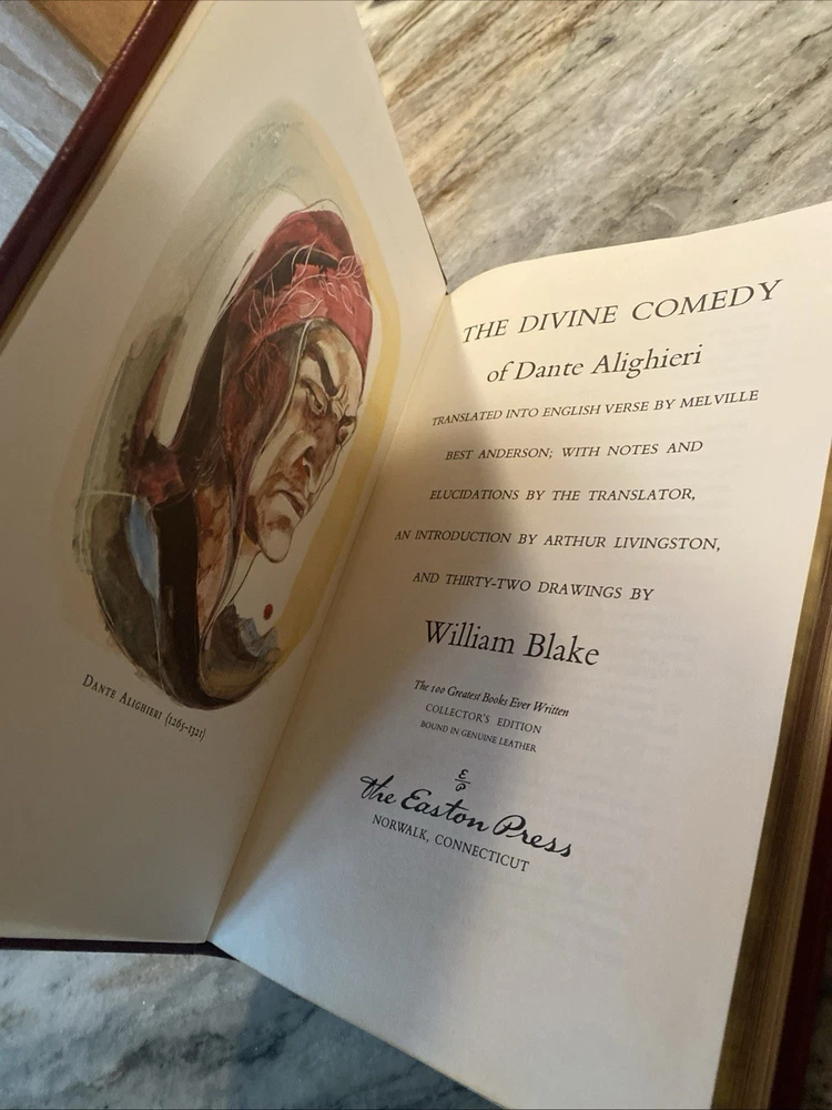 The product is a collector's edition of "The Divine Comedy" by Dante Alighieri, published by Easton Press in 1978. This leather-bound book is part of the 100 Greatest Series and features illustrations by William Blake. It is an original edition in English, making it a valuable addition to any literature and fiction collection. The book is unopened and in pristine condition, making it a desirable item for book collectors and enthusiasts of classic works.