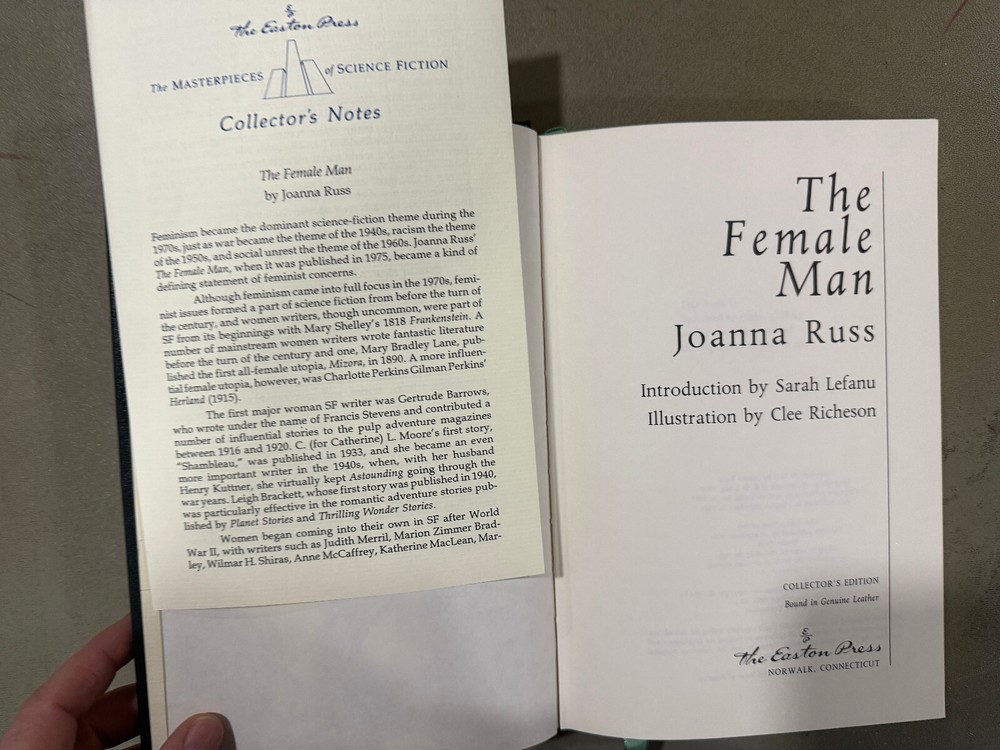 The Female Man by Joanna Russ Easton Press Sci Fi Series Excellent Condition with Collectors Notes! New Books get listed every week !!! 100s of Easton Press and Franklin Library books available!! All books get cleaned with a leather cleaner to remove any dust, odor and restore beauty of leather!! Combined Shipping Discount: USA buyers - every book $1 off International combined shipping: 1 or 2 books - $45 3 or 4 books - $75 5 + books $17 per book 10+ books $13 per book WE SHIP DAILY!! RETURNS: Hassle-Free 30-days return policy and we pay for a return !! Check our Inventory (Link to eBay Store): http://stores.ebay.com/EastonFranklinBooks