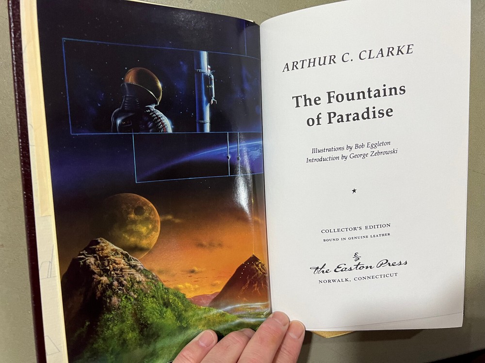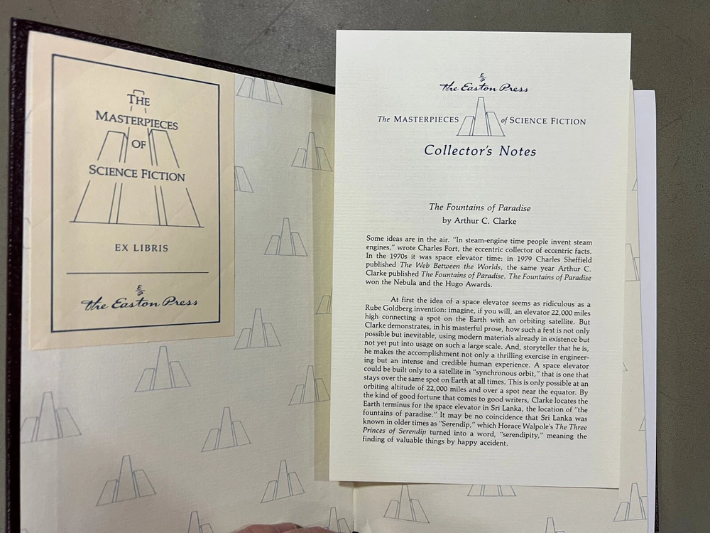 This Easton Press edition of *The Fountains of Paradise* is stunning—deep blue leather, gold accents, and crisp pages in like-new condition. The included collector's notes and bookplate add a special touch, and it's clear the seller takes great care in preserving these books. Perfect for any sci-fi lover or collector, especially fans of Arthur C. Clarke. Plus, the combined shipping discount is a huge bonus! Highly recommended!