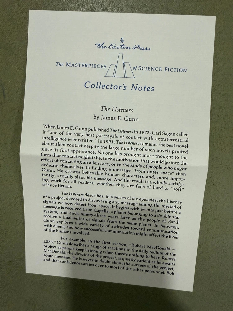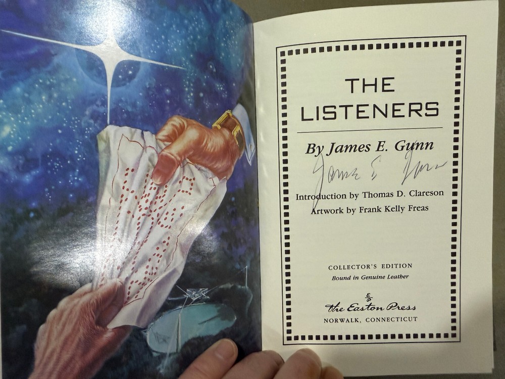 The Listeners James E. Gunn Privately Signed Easton Press 1st Edition Science Fiction Excellent Condition with Collectors Notes ! New Books get listed daily !!! 100s of Easton Press and Franklin Library books available!! All books get cleaned with a leather cleaner to remove any dust, odor and restore the beauty of leather!! Combined Shipping Discount: USA buyers - every book $1 off International combined shipping: 1 or 2 books - $45 3 or 4 books - $75 5 + books $17 per book 10+ books $13 per book WE SHIP DAILY!! RETURNS: Hassle-Free 30-days return policy and we pay for a return !! Check our Inventory (Link to eBay Store): http://stores.ebay.com/EastonFranklinBook