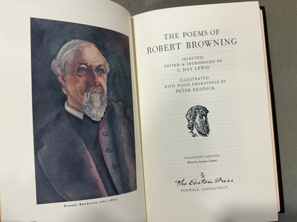 The Poems of Robert Browning Easton Press 100 Greatest Series Very Good Plus Condition; attached NEW Bookplate ! New Books get listed daily !!! 100s of Easton Press and Franklin Library books available!! All books get cleaned with a leather cleaner to remove any dust, odor and restore the beauty of leather!! Combined Shipping Discount: USA buyers - every book $1 off International combined shipping: 1 or 2 books - $45 3 or 4 books - $75 5 + books $17 per book 10+ books $13 per book WE SHIP DAILY!! RETURNS: Hassle-Free 30-days return policy and we pay for a return !! Check our Inventory (Link to eBay Store): http://stores.ebay.com/EastonFranklinBooks