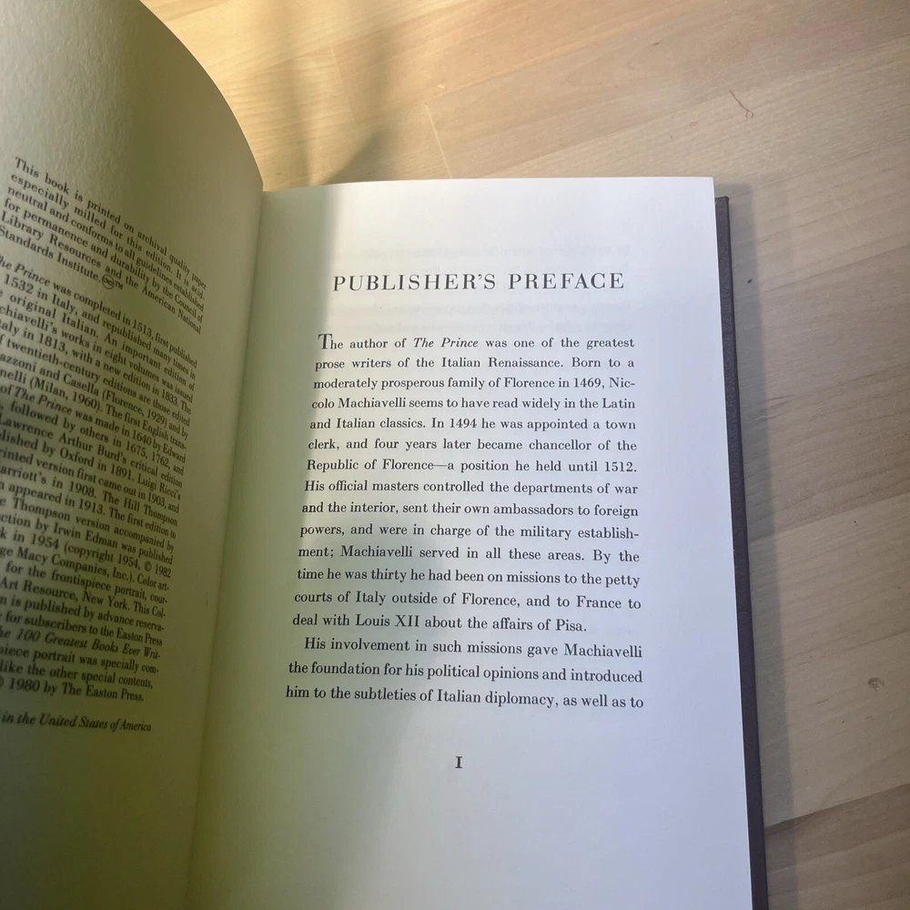 This Easton Press edition of *The Prince* is a stunning collector's piece! The leather binding is pristine, with no noticeable wear, and the gold leaf detailing remains sharp. The spine is tight, suggesting it’s barely been opened—almost like new. A fantastic find for any Machiavelli enthusiast or collector of fine books. Highly recommended!