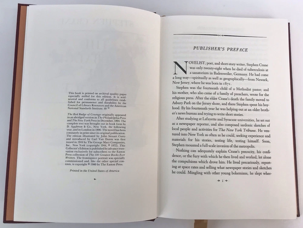 Easton Press The Red Badge of Courage by Stephen Crane 100 Greatest Series Excellent condition. Mostly was just on display. Please see pictures for condition details.