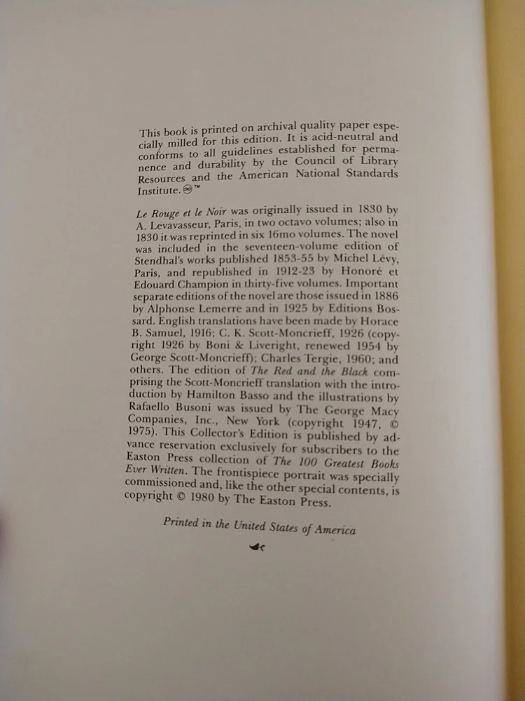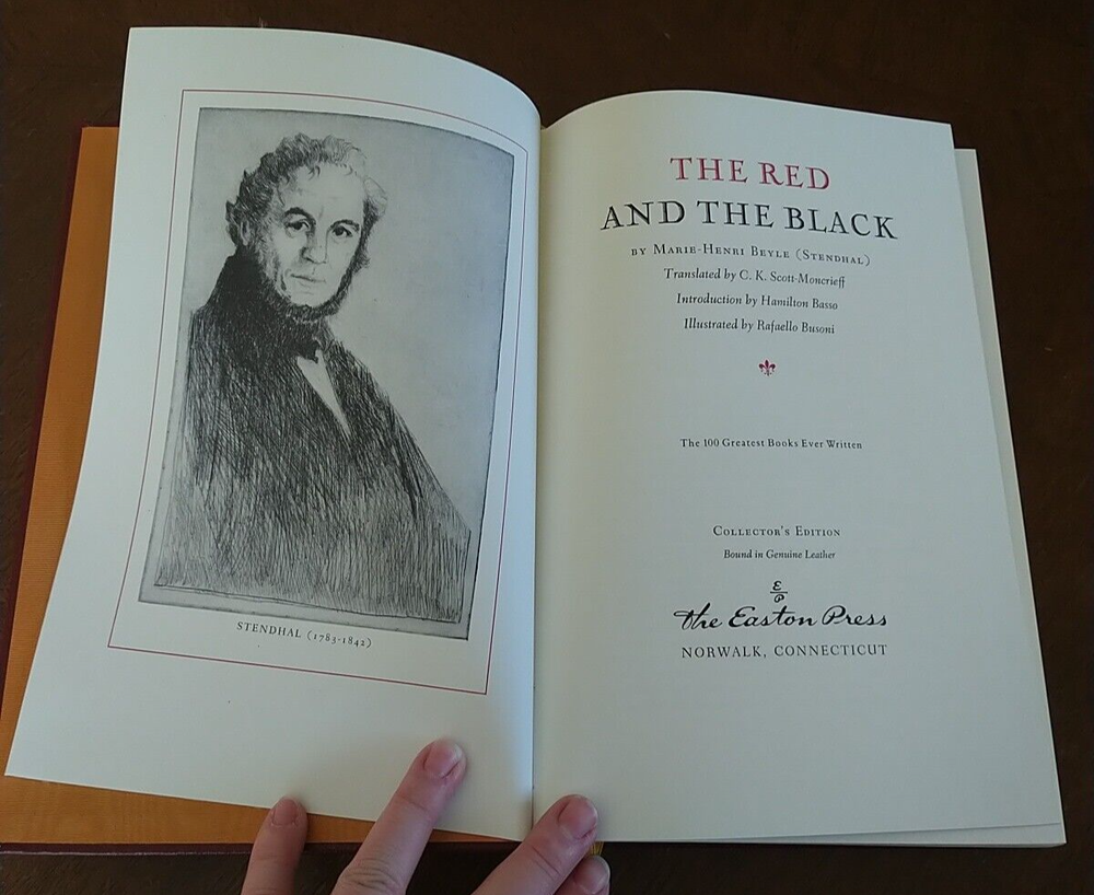 Easton Press The Red and the Black 1980 Leather Bound Collector's Edition Book Very good condition. Some wear on the gilt near the headcap. Also some inscriptions by prior owner on endpaper (see last ...