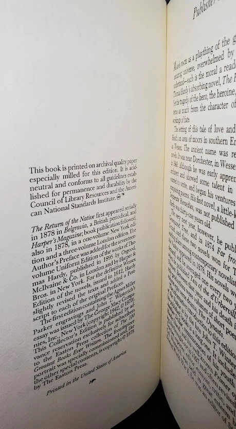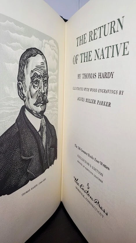 Easton Press Collector's Edition of The Reurn of the Native by Thomas Hardy. Gilt cover accents and page ends. Archival-quality paper is used with sewn-in pages and a hubbed spine. Satin ribbon page mar ker. Handsome and heirloom quality deep green in color book to last for generations. Part of The 100 Greatest Books Ever Written series. Pre-owned in excellent fine condition, a few cover scuffs noted in photos from storage, and price reflected. Very cool find for your home library! Please see the images for a complete visual description of the condition. Sold as is. All sales are final. Shipped and packed securely using recycled and re-purposed materials whenever possible. Thanks for checking out my cool finds!