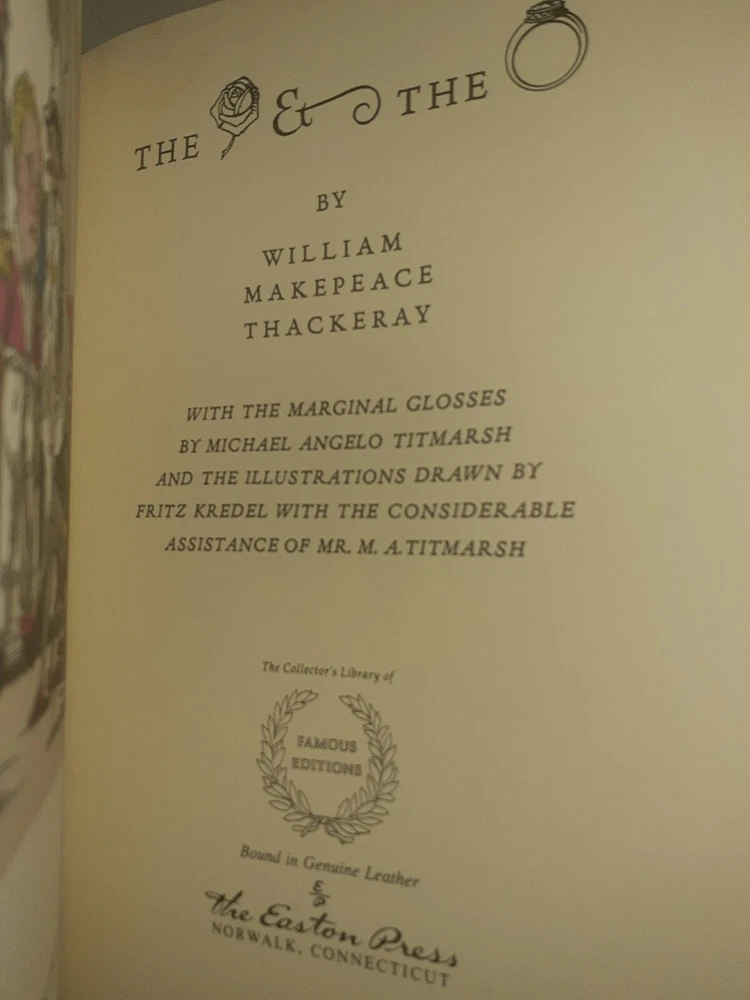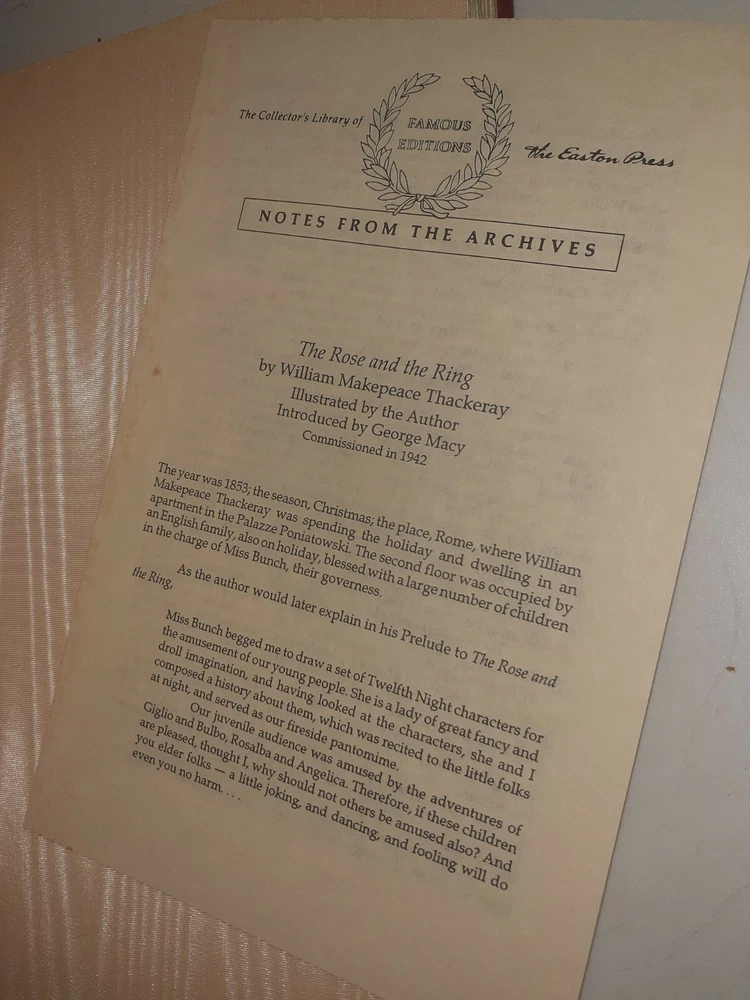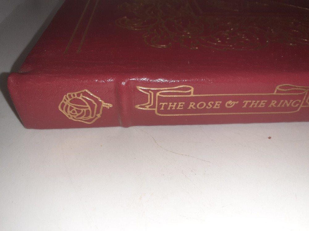 There is some spotting on the gilding , other than that this is a brand new book This luxurious edition of William Makepeace Thackeray's classic tale, "The Rose & The Ring," is a must-have for any collector of fine literature. Bound in exquisite leather and printed in English, this 1991 edition from Easton Press is in excellent condition and has never been read. With special attributes that make it a true treasure, this book is a rarity in the world of antiquarian and collectible books. The publisher, Easton Press, is known for its commitment to quality and this edition of "The Rose & The Ring" is no exception. It is a beautiful addition to any bookshelf and is sure to impress any lover of literature and fiction.