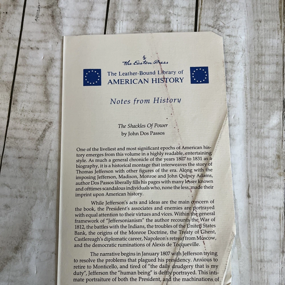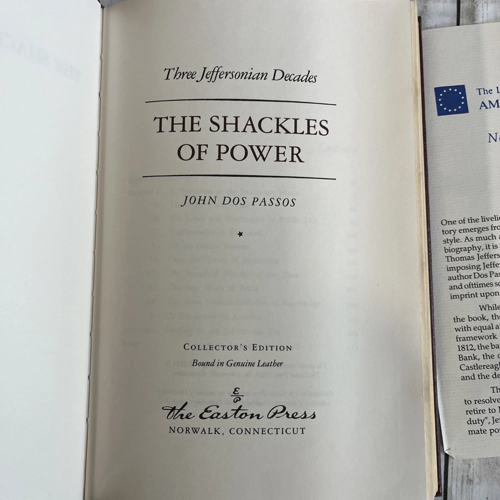 This vintage hardcover book, "The Shackles of Power" by John Dos Passos, is a collector's edition published by Easton Press in 1988. The book is bound in leather and was originally printed in Connecticut, United States. It is written in English and the topic is modern literature. The book is in its original state and is not a facsimile. The unit quantity is one and it is suitable for North American region buyers only.