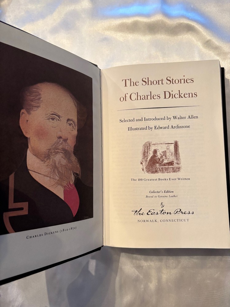 Short Stories by Charles Dickens - Easton Press 100 Greatest Books Edition Description: This exquisite edition of Short Stories by Charles Dickens is part of the Easton Press 100 Greatest Books collection. Bound in luxurious leather, this volume features intricate gold detailing, gilded page edges, and a satin ribbon marker. The book is printed on acid-neutral paper to ensure its longevity, making it a perfect addition to any literary collection. Condition: Cover: Excellent condition with no visible wear or damage. Pages: Clean and unmarked, with no creases or tears. Binding: Tight and intact, ensuring the book opens smoothly. Features: Luxurious leather binding Gold detailing and gilded page edges Satin ribbon marker Acid-neutral paper Why You'll Love It: This edition of Short Stories by Charles Dickens is not just a book; it's a work of art. Whether you're a collector of fine books or a lover of classic literature, this Easton Press edition will be a cherished addition to your library.