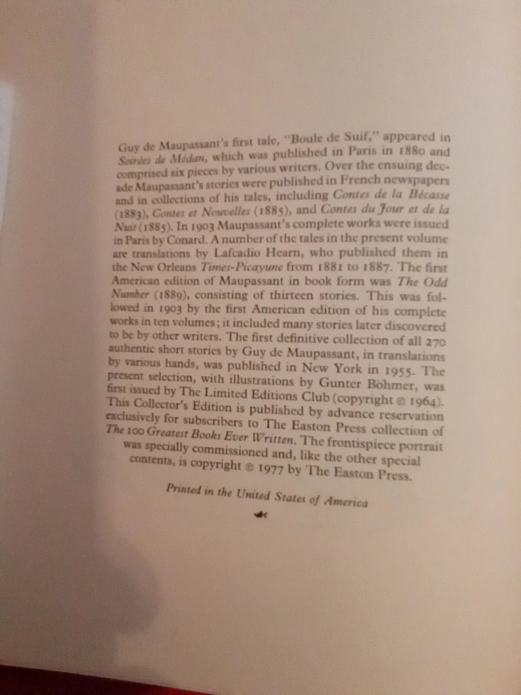 Easton Press The Tales of Guy de Maupassant 100 Greatest Series ------- I ship everything with Priority Mail. Upon payment, item will be shipped out in next 3 days! If you have any questions, please contact us before bidding / purchasing and you will receive clear answers. You get what you see on the item's picture. Every picture is taken while the listing. No returns accepted but in case of a return, buyer pays the return shipment. (If you are satisfied with what you receive, please leave a feedback and I will return it) Thank you for looking.