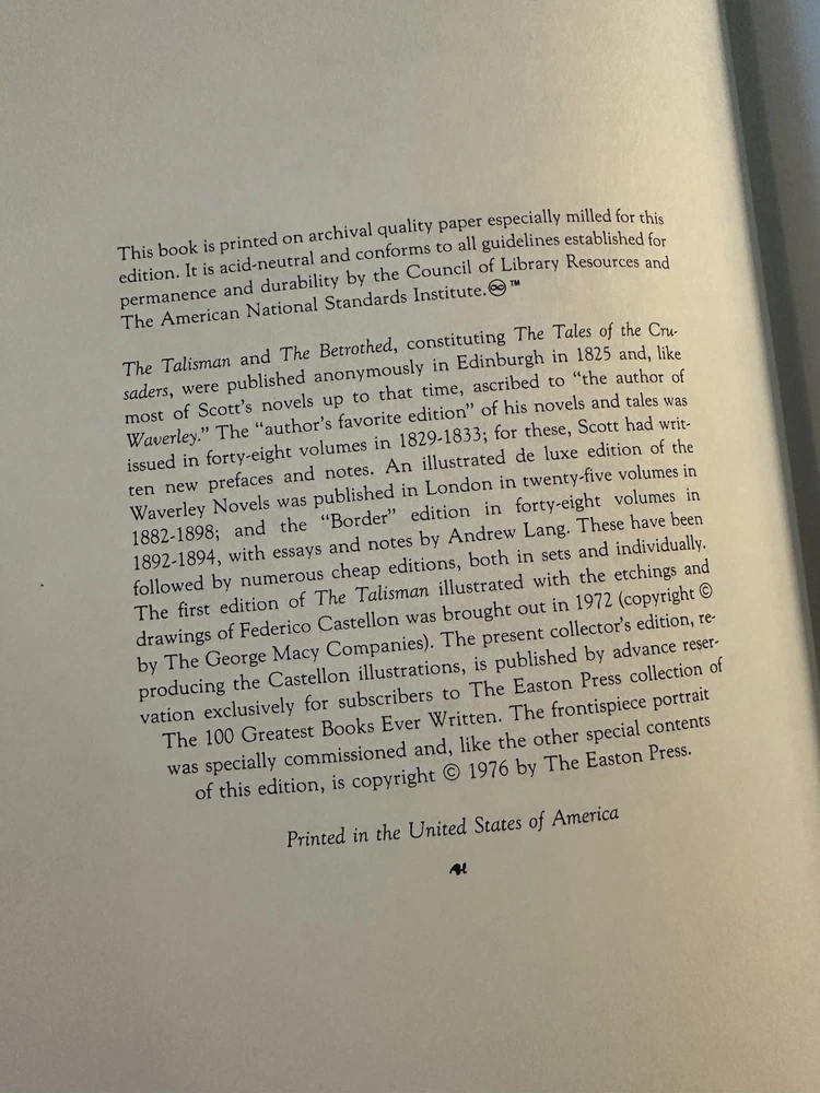 This Easton Press edition of *The Talisman* is absolutely stunning! The leather binding feels luxurious, and the gold gilt adds a touch of elegance. The minor flaws are barely noticeable and well-documented—definitely worth it for a collector. A beautiful piece of classic literature that looks amazing on the shelf!