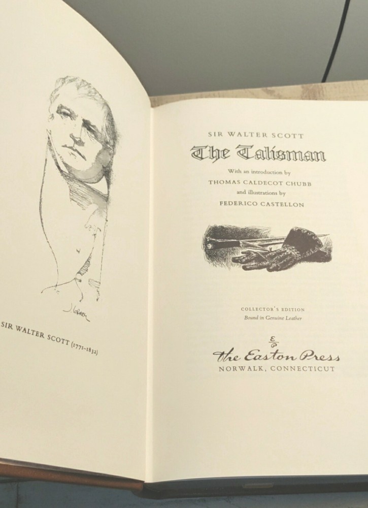 Experience the luxurious edition of "The Talisman" by Sir Walter Scott, published by Easton Press in 1976. This collector's item features a beautiful leather binding and is in mint condition. The book is richly illustrated by Federico Castellon and includes special attributes that make it a must-have for any book collector or literature enthusiast. The story is a classic tale of adventure and heroism, perfect for those who love the topic of classics. Don't miss out on the opportunity to own this limited edition volume.