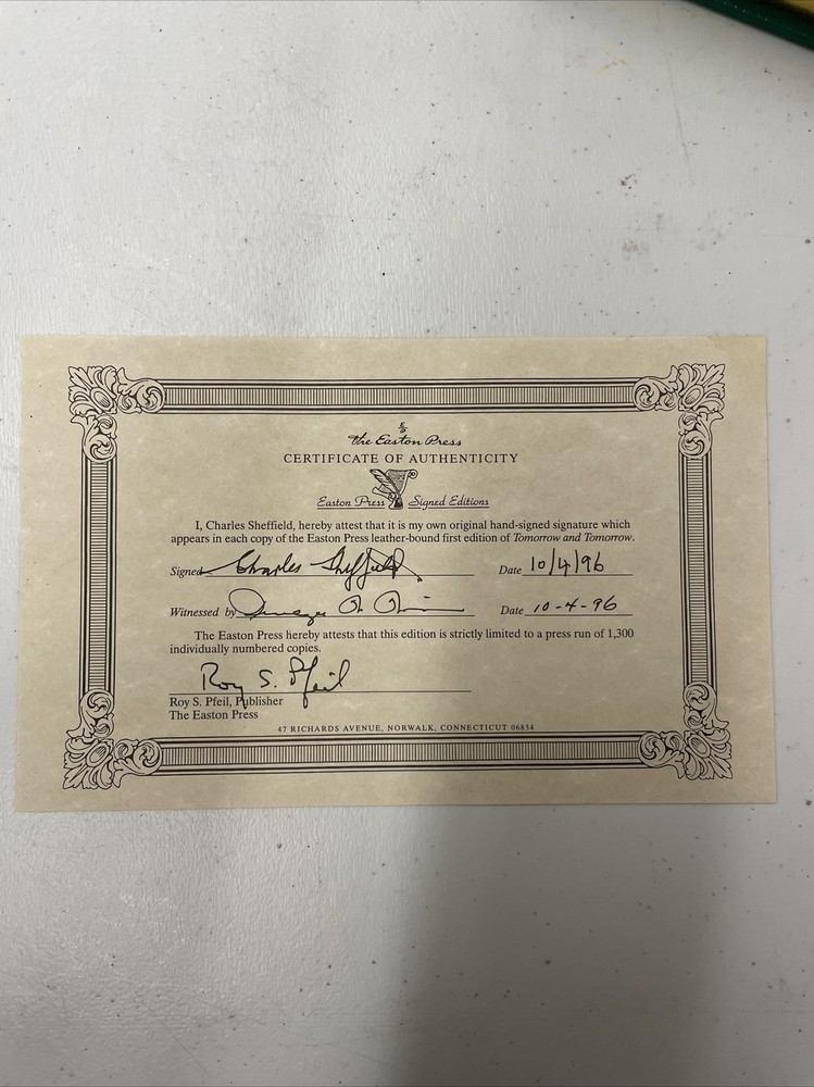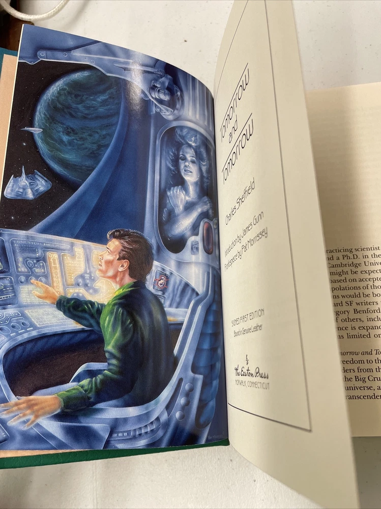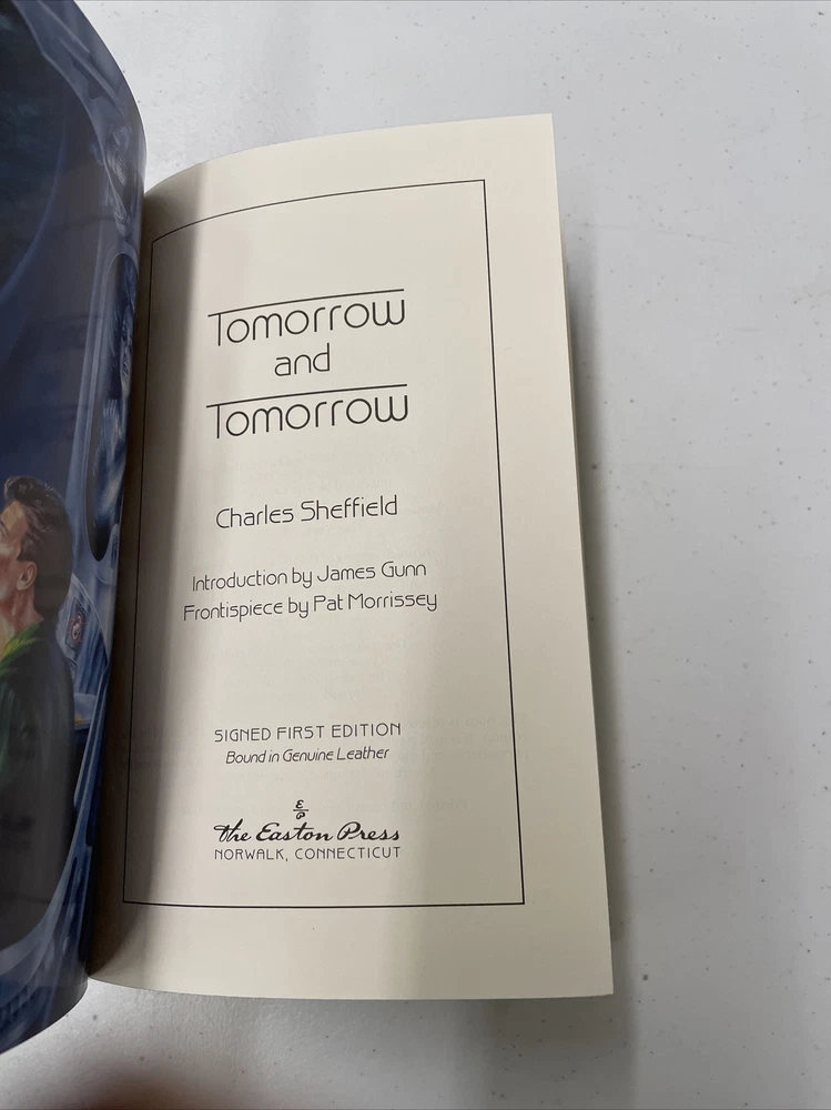 Easton Press Tomorrow and Tomorrow - Charles Sheffield w/ coa. FIRST EDITION. This is a beautiful book that is in very good condition. The leather is in perfect shape and you can’t tell any wear on the pages. There is some damage on the inside binding which is shown. Message if you have any questions.
