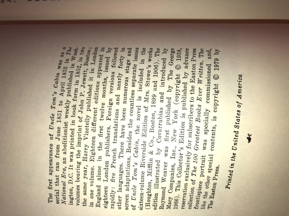 EASTON PRESS Edition of Uncle Tom's Cabin by Harriet Beecher Stowe This is the 1979 edition of Uncle Tom's Cabin, bound in green leather with gold tooling and spine. It has blue watered silk endpaper showing some light fading along the outside edges and a blue silk book mark. The portrait of Harriet Beecher Stowe as the frontispiece was specially commissioned by Easton Press. This is one The Collector's Edition of The One Hundred Greatest Books Ever Written and it's in gently used condition. I've listed the shipping as Priority Mail so you can possibly get it in time for Christmas (as long as it's purchased before December 15, 2024. After that time, I can't guarantee delivery before the holiday. Come see what other Easton Press and Other Books is for sale in our eBay store, so please bid here and then browse thru and find more selections . Welcome to Depression Glass Warehouse !! We're glad you stopped by! Shopping with us, you can expect premium customer service and wonderful products. Please Sign up for our Store Newsletter AUCTION/SALE TERMS: 1. Payment within 2 days of the end of the item listing, in USD. 2. If you have questions about an item? ASK ME FIRST! Use this link ASK SELLER A QUESTION ; 2. ALL Items are insured by me prior to shipping so if it arrives damaged, please contact me before contacting eBay. I provide full refunds upon receipt of photographs/jpgs of damage (I need those for insurance claims).No photos? No reimbursement. 3. If you prefer a particular class of postage, SELECT that on the invoice before paying and contact me if necessary for a revised invoice. If you want your items more quickly, then select Priority Mail or Priority Mail International. If cost is a consideration, then, please realize YOU selected the lower cost and don't ding my stars cause it takes forever to arrive. 4. Anything that is slow to arrive, contact me first. Trust me, I hate losing things in the mail as much or more than you do and will hunt them down if at all possible. 5. HASSLE FREE RETURNS!! Just send it back. A heads up email saying it's coming back is appreciated. Refunds are by the same method as the original payment upon my receipt of the returned item in as shipped condition, which means with all tags, labels and packaging intact and undamaged. Do not wear it or wash it or play with it or serve dinner on it and then decide tor return it. That is not acceptable and I will not refund under those circumstances. . 6. International Customers - we do not prepay the VAT or the Customs Duty, that is your responsiblity upon receipt. Our Post Office knows we sell on ebay and they wouldn't accept a customs form that said "gift". Besides it is illegal and a violation of e Bay TOS so we don't do it. Once you've bid here, please come see what else we have at Depression Glass Warehouse
