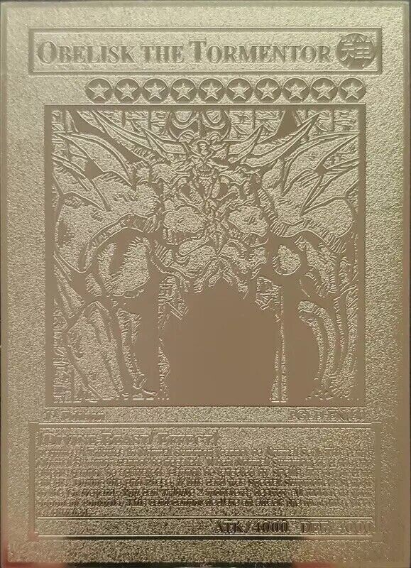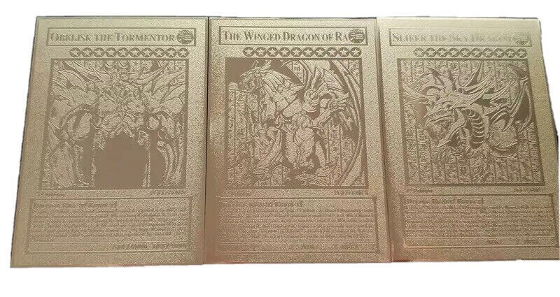 Grab your hands the iconic and gorgeous Full Color Egyptian God Metal Yugioh Cards! This includes Obelisk the Tormenter, Slifer the Sky Dragon, and the Winged Dragon of Ra. These cards are absolutely stunning and are sure to be a wonderful gift for any Yugioh fan! Laser-etched Gold Metal Cards More Durable than Paper Cards High-quality Design Fits in a 3-Ring Binder Beautiful, gold metal