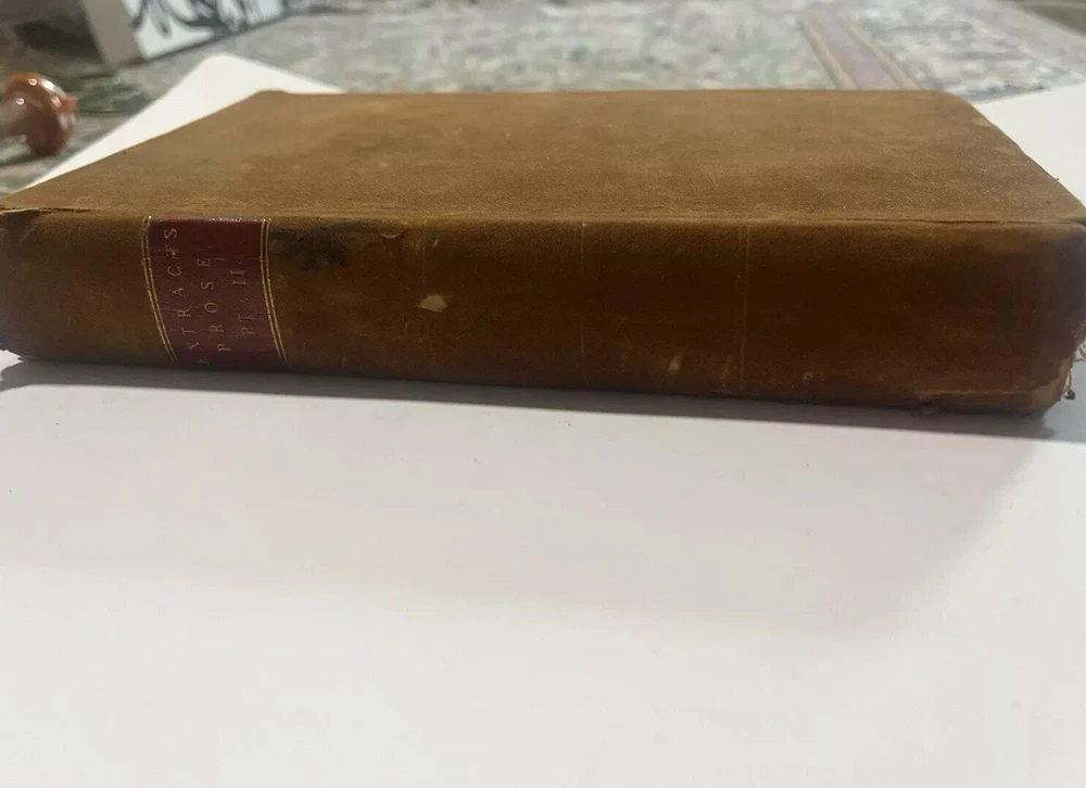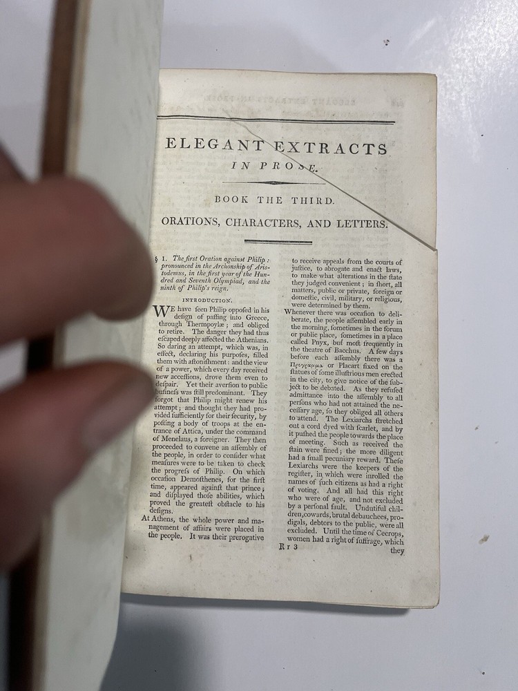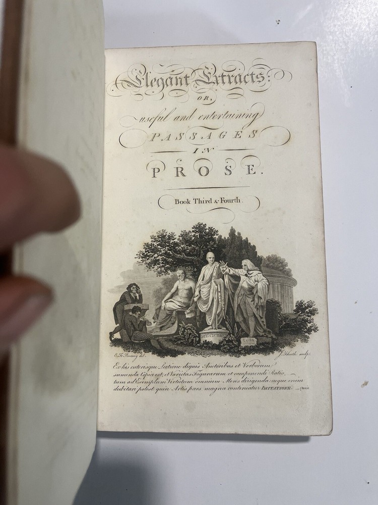 Elegant Extracts: Prose - “Book Third & Fourth” - Antique Leather-Bound Edition Description: For sale is a rare, antique volume from the “Elegant Extracts” series, focusing on Useful and Entertaining Passages in Prose. This volume includes Book Third & Fourth, which feature Orations, Characters, and Letters. Features: • Title: Elegant Extracts: Prose - Book Third & Fourth • Binding: Leather-bound, showing signs of age and wear (see photos). • Illustrations: Includes decorative engravings and a beautifully designed title page. • Condition: • Pages are intact with minor aging and wear. • Binding is fragile but holding. • Please refer to photos for exact condition. This book is a wonderful addition to any collection of antique literature or educational texts.