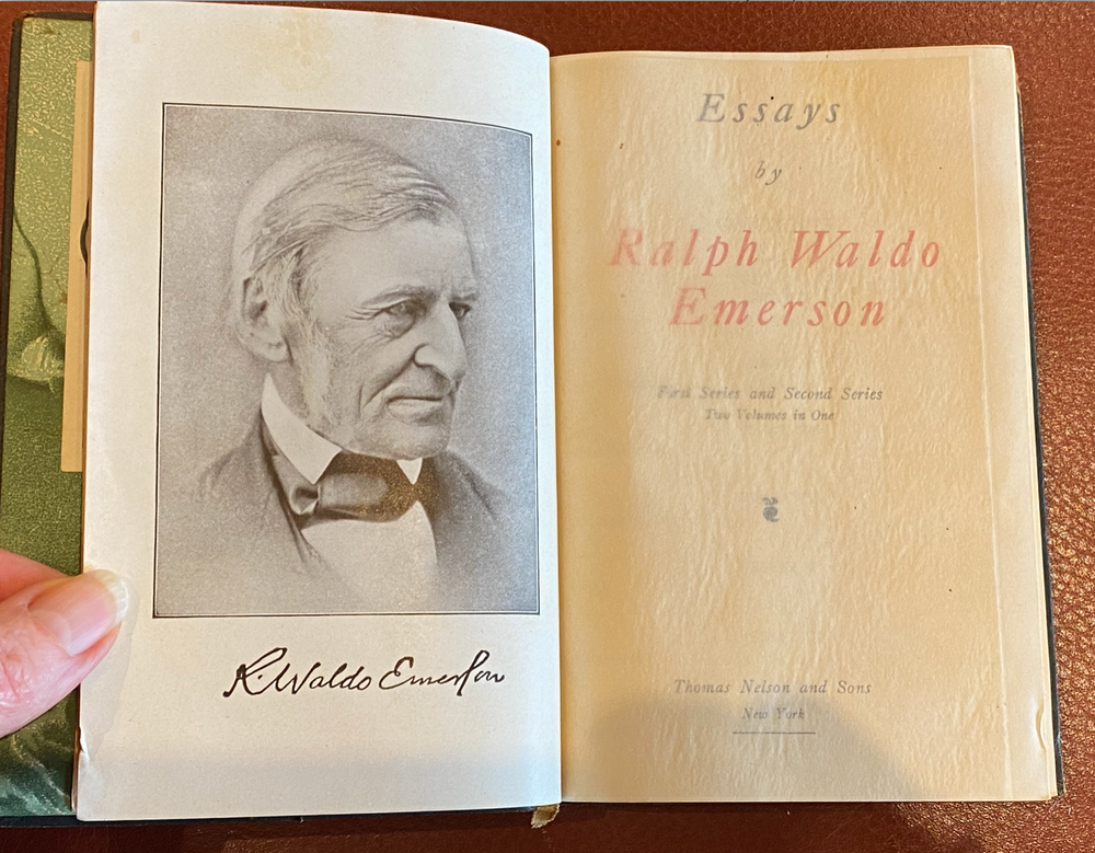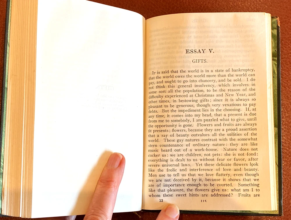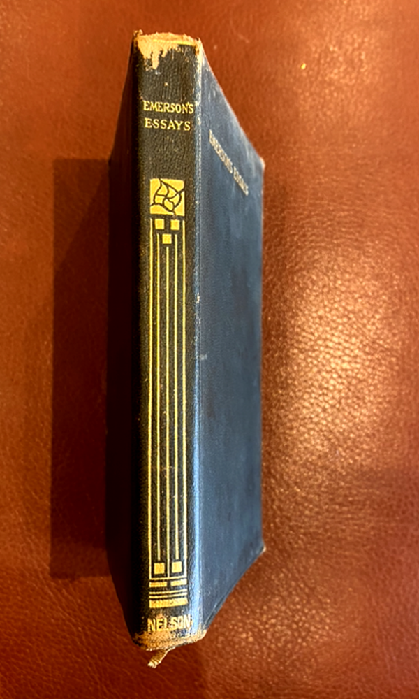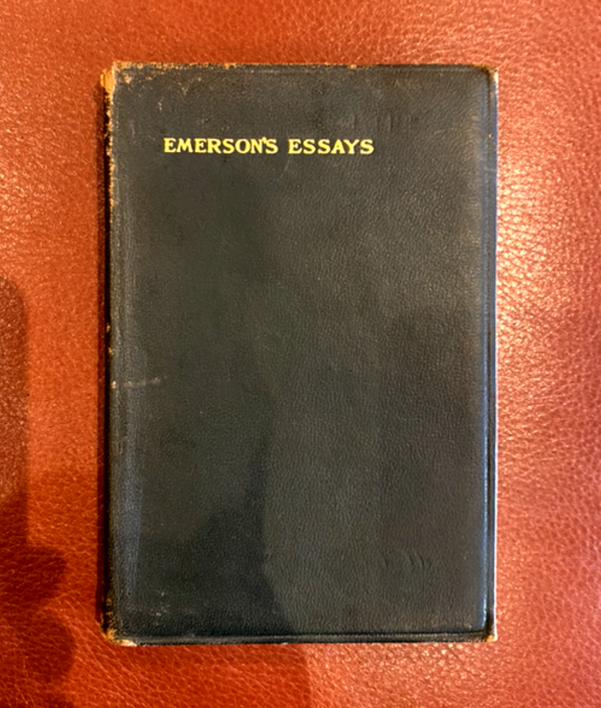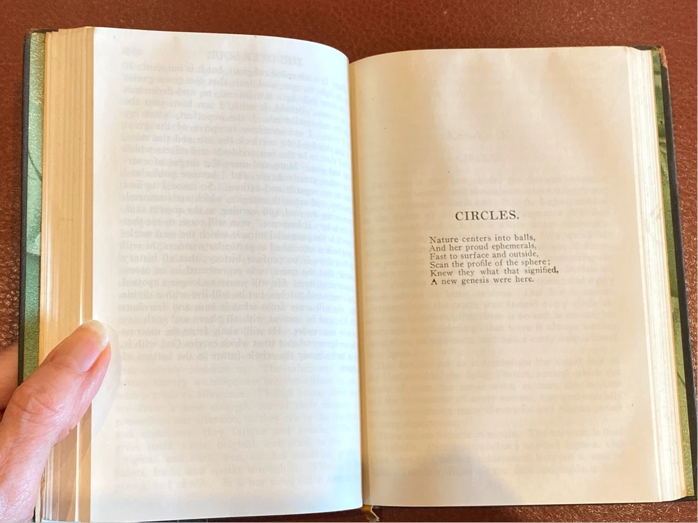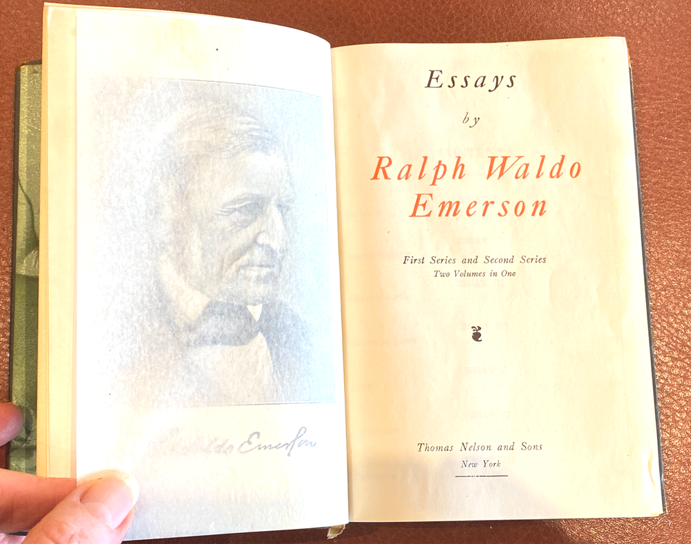 This 6 1/2 x 4 1/4 inch edition has a black leather cover, decorative endpapers, a ribbon bookmark, and a frontispiece portrait of Ralph Waldo Emerson with a tissue page protector between it and the title page. It does not have a date of publication, but an antique bookseller has it dated as circa 1910, which makes sense, as it belonged to my grandmother. It has been stored since her passing, and has always been in a non-smoking, pet-free home. There is a minor page yellowing due to age, but they seem quite bright and shiny. The corners or the cover show signs of wear. The binding feels quite tight. My grandmother put a nameplate sticker on the inside front cover. Please see all pictures. Thank you!