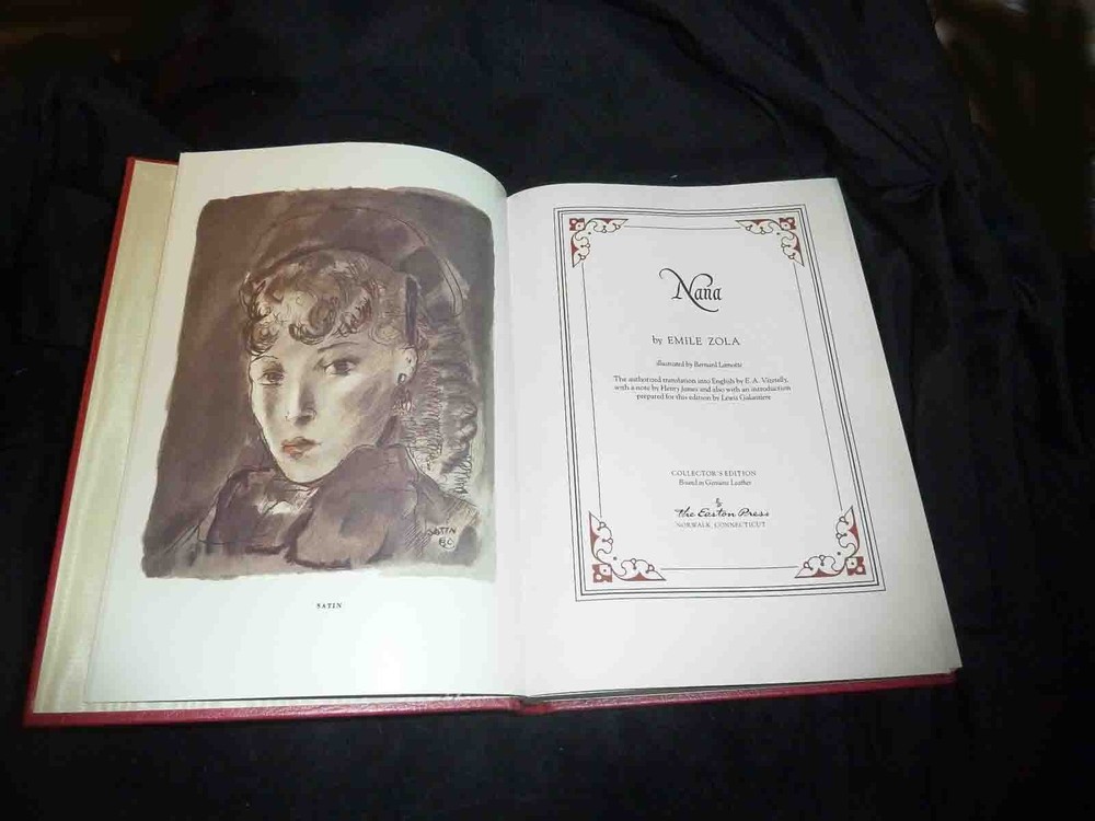 OUT of PRINT Usually ships same day, if order received in the morning or, ships next day, if order received in the afternoon. There are many copies and version of Emile Zola's NANA. This is an elegant book version. Great for display of gift Please have a look at listing on Easton Press, Leather Bound Books Books are organized by categories, kind of easy (more or less) for you to figure out a title you might want or, maybe, see a title you never heard of before item : book Title, Nana Year 1976 hard cover, leather bound, gilded edges and lettering on the cover and spine leather is red color elegant author : Emile Zola (1840-1902, author) , Bernard Lamotte (illustrations) language : English publisher : Easton Press illustrations : color, B&W ISBN --- book size 10.25" x 8" x 1.5" pages 410 book weight about over 3 lbs condition: almpst like new. Short-coming: top gild uneven, looks like rubbing-- see picture. Otherwise absolutely like new. in stock, ready for immediate delivery Book will be packed in paper, bubbles, plastic bag and it will be shipped in a cardboard box. USPS tracking number included. Shipping cost is actual cost: Shipping cost includes the money paid to the Post Office AND ebay fees on shipping. FREE (on me) : packing papers, plastic bags, bubbles, tape, plastic mailing envelopes and boxes (most boxes are recycled) loc::easton-01