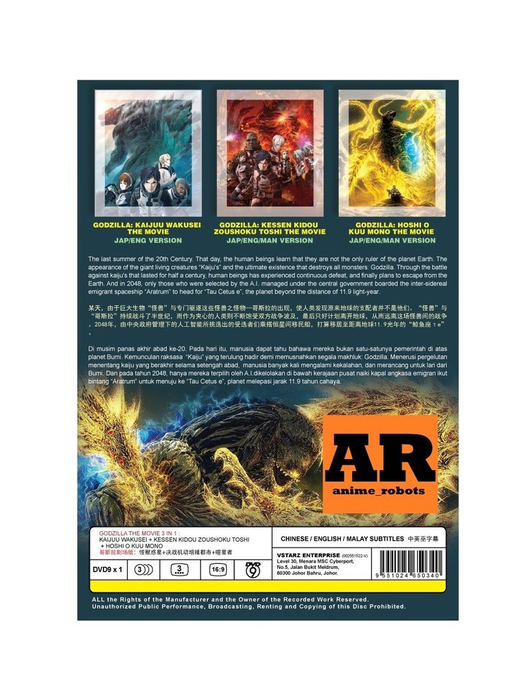 Product Information: Title : Godzilla The Movie 3 in 1 (Kaijuu Wakusei + Kessen Kidou Zoushoku Toshi + Hoshi O Kuu Mono) Numbers of episode : 3 (Movie) Numbers of discs : 1 Language : Japanese / English Subtitles : English / Chinese Format : ALL Region Condition : NEW, Original & Licensed Item Genres : Action , Adventure , Sci-Fi Storyline: The last summer of the 20th Century. That day, the human beings learn that they are not the only ruler of the planet Earth. The appearance of the giant living creatures "Kaiju's" and the ultimate existence that destroys all monsters: Godzilla. Through the battle against kaiju's that lasted for half a century, human beings has experienced continuous defeat, and finally plans to escape from the Earth. And in 2048, only those who were selected by the A.I. managed under the central government boarded the inter-sidereal emigrant spaceship "Aratrum" to head for "Tau Cetus e," the planet beyond the distance of 11.9 light-year. However, the environmental condition differences between that of the Earth and Tau e, which they finally arrived after 20 years were far beyond the predicted numbers, and was not an environment considered to be habitable by human beings. The young man on the emigrant ship: Haruo, who saw his parents killed by Godzilla in front of his eyes when he was 4 years old, had only one thing in his mind for 20 years: to return to the Earth and defeat Godzilla. Shut out from the possibility of emigration, as the living environment in the ship deteriorates, the group of "Earth Returnists" led by Haruo became the majority, and determines to head back to Earth through a dangerous long-distance hyperspace navigation. However, the Earth they have returned to has already passed the time of 20,000 years, and has become an unknown world with the ecosystem reigned by Godzilla. At the end, will human beings win back the Earth? And what will Haruo see beyond his fate? Shipping & Handling: - All order will be dispatched out from Malaysia within 1 - 3 working days after payment was made. - All order are ship by registered air mail with tracking number (delivery time normally takes 14 - 21 working days). Payment: - We only accept payment by PAYPAL . Packaging: - All order will fully protected with bubble wrapped. Return Policy: - All item are not REFUNDABLE and RETURNABLE . International Buyer’s Policy: - International shipments may be subjected to additional custom fees and duties. We DO NOT pre-bill any import duties , customs fees or tariffs imposed by various government on the product. - Import duties and taxes may be applied to certain countries and varies from country to country. Customs fees is incurred for customs clearance or import sales tax is levied on deliveries , the charges shall be borne by the BUYERS . - Buyers have to clarify the customs laws and regulations with the local authorities to obtain specific information BEFORE PURCHASE . Thank you so much ! Please feel free to contact us if you have any questions.