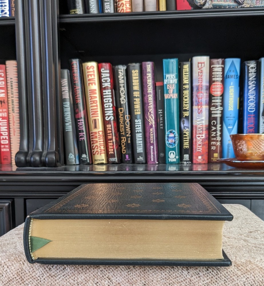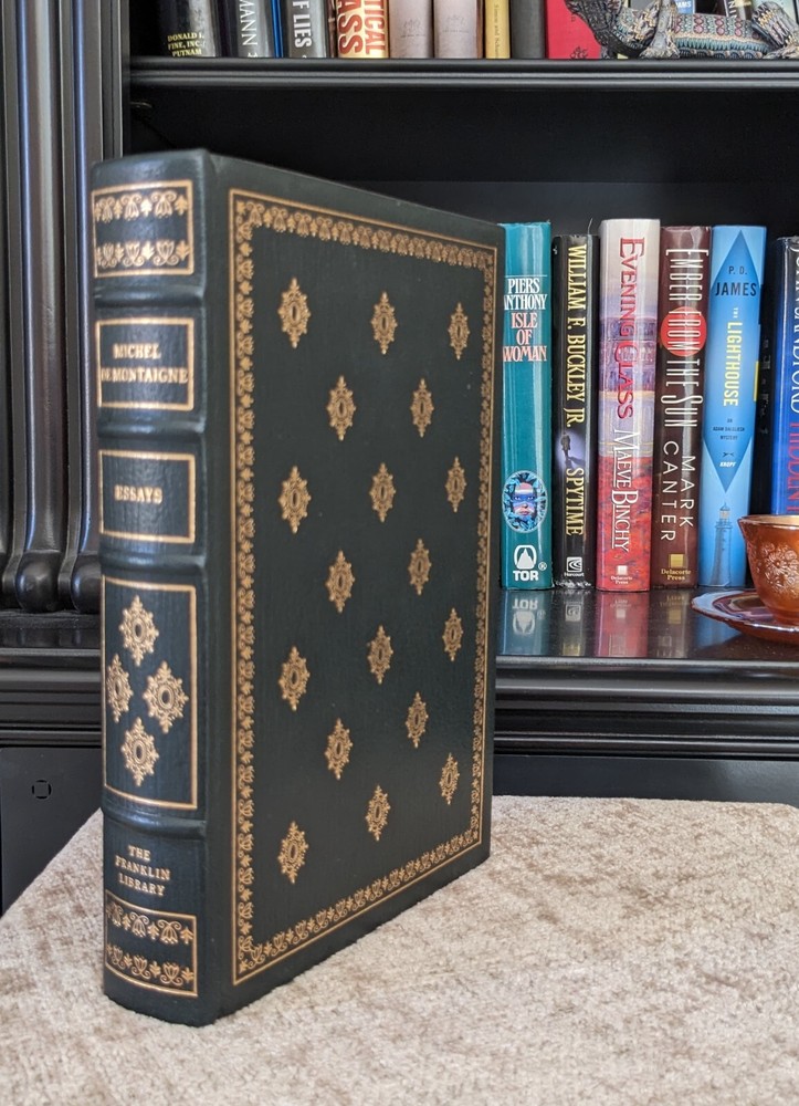 Michel de Montaigne, a 16th-century French jurist, advisor, and diplomat whose many adventures would make a compelling autobiography. Instead, Montaigne writes a series of short works that examine his innermost thoughts and feelings, attitudes and beliefs, preferences and daily habits. This would seem a dull topic, but Montaigne’s charm, wit, and wisdom shine through and make the mundane seem fascinating. His attitude is tolerant and open-minded for his era, and his ideas and insights remain relevant today. Illustrated by Gonzalo Fonseca. First Edition, First Printing. As New (AN) condition (see description of terms). Accented in 24k gold, printed on archival paper with gilded edges. Smyth sewing and concealed muslin joints. Bound in full leather with hubbed spines and sewn-in satin ribbon book marks. Gilt textblooks and gilt tooling on the boards. Silk moire end papers - ribbon and silk colors match. Unopened and unread copies. If you need pictures of the inside front covers I can get them but I will not open the book fully to do so. . .it will make for awkward pictures. NOTES: (AN) - As New - unread, unused, clean and flawless copy. (F) - Fine - as close to As New condition except it mave have been previously opened or carefully read. (VG) - Very Good - shows signs of previous ownership and use, but still a nice copy. Flaws or defects (former owners name [FON] or former owners initials [FOI] should be noted). (G) - significant wear - tears in DJ, wear on the edges of DJ or boards as well as text block. All issues should be noted. (F) - Fair - noticeable wear. Some non-essential pages missing (front and rear endpapers). Smyth sewing - stiching groups of folded paper together with dinder thread. THe folded papers, called Signatures, are usually large sheets of pinted matter that are folded into groups of 8-32 pages. Each signature is sewn individually with multiple stiches down its length. THe signatures are then joined together to create a book block which is then glued to paper or hardcover case. Muslin joints - small groves that runs vertically down the book itself between the book boards (book cover) and the spine. It bends when the book is open. Only on hard cover books. Muslin cloth shrinks while drying so it molds itself to the board edges to make them sharp and defined. Franklin Library, the distribution arm of the Franklin Press, began publishing in 1973 and closed permanently in 2000. The 100 Greatest Books of All Time series, published between 1974 and 1982, is among the most collectible work from Franklin Library. The heavily illustrated collection features remarkable works by literature's most legendary writers. First copies as well as signed first copies published by Franklin Library are "limited" to an unstated number of copies. Franklin Library did not produce reprints and books were subscription only. This series is "The 100 Greatest Books of All Times". Almost all of their full leather series had ID blocks on one of their first few pages that identified the series. As an example, their series, The 100 Greatest Books of All Time which ran from the beginning of the company in 1974 to 1983 had a series specific ID Block that read, "This limited edition of (title of the book) is published exclusively for subcribers to The Franklin Library collection The 100 Greatest Books of All Time". Their other series, The First Edition Society, which ran from 1976 to 1981 had an ID Block that read, "This limited first edition of (title of book) by (author of the book) has been privately printed exclusively for members of The First Edition Society".