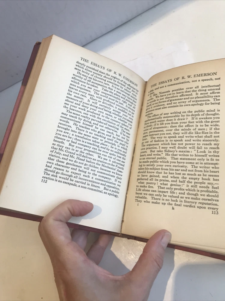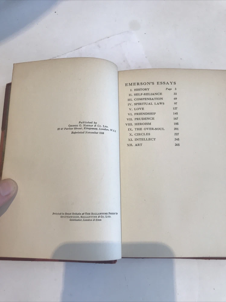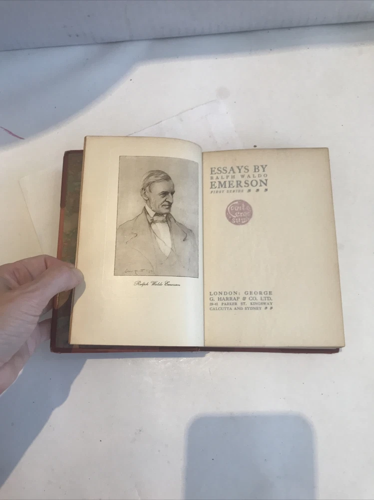 Emersons essays First Series The Harrp Library Hardcover Book reprint 1926 Preowned Acceptable condition wear to boards chipping ,rubbing wear , discoloration, boards exposed at corners leather ripped at binding bookplate affixed to inside of board webbing exposed at back inside board and end page (see Photos) binding loose webbing exposed between some pages 112/113 all pages intact last blank page has imprint left over from erased writing in pencil that was removed