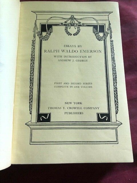 Essays by Ralph Waldo Emerson-First and Second Series in One Volume-Leather Book. With an introduction by Andrew J. George. New York. Thomas Y. Crowell Company Publishers. Published, 1926, by Thomas Y. Crowell Company. This book is in very good condition overall. Some wear to cover from shelf and time. See pictures for further details on condition. This is a nice, leather-bound piece for the collector/ enthusiast of Emerson. Feel free to contact me with any questions and thank you for your interest!
