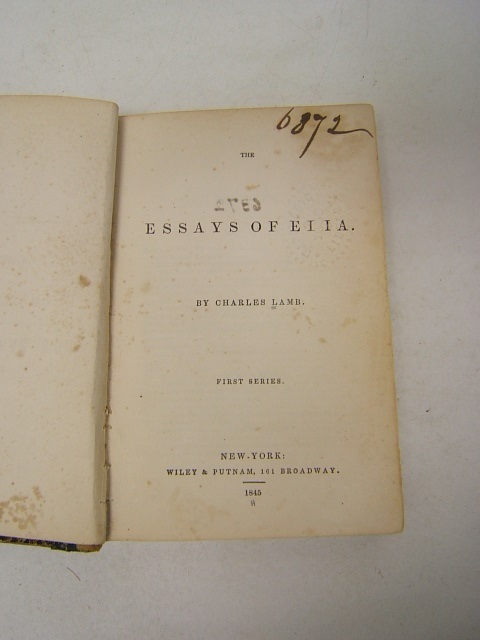 Essays of Elia by Charles Lamb 2 Vol. in 1 First Series Copyright 1845 Essays of Elia by Charles Lamb 2 Vol. in 1 First Series Copyright 1845 Description § Essays of Elia 2 Volumes in One First Series 7 1/2" Height Condition: Cover is loose but attached, Cover is worn & rubbed, brown age stains on pages, no loose pages Free shipping Condition: Acceptable Payment Paypal Shipping Domestic shipping: Fixed Shipping Charges. Shipping Carrier Domestic Usps Book Rate $0.00 I will ship to: United States Thank you for visiting the Juniata General Store. We are located in the heart of Central Pennsylvania just up the road from the beautiful Juniata River. We offer a wide variety of merchandise, both new and vintage. Most of our inventory is one of a kind items and we add new items constantly so check back often. Vendio Images: More than just a pretty image. 250+ Mobile Responsive & Active Content Free Listing Templates with Vendio Sales Manager. Vendio provides powerful selling automation for sellers of all sizes. Get business information that counts! - Vendio Counters are active content free.