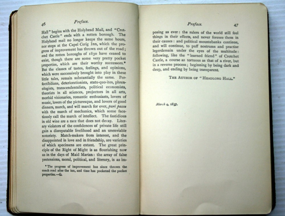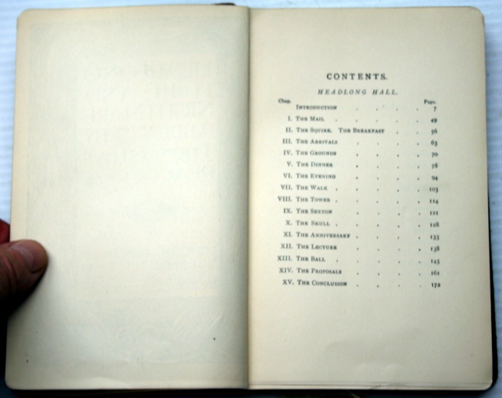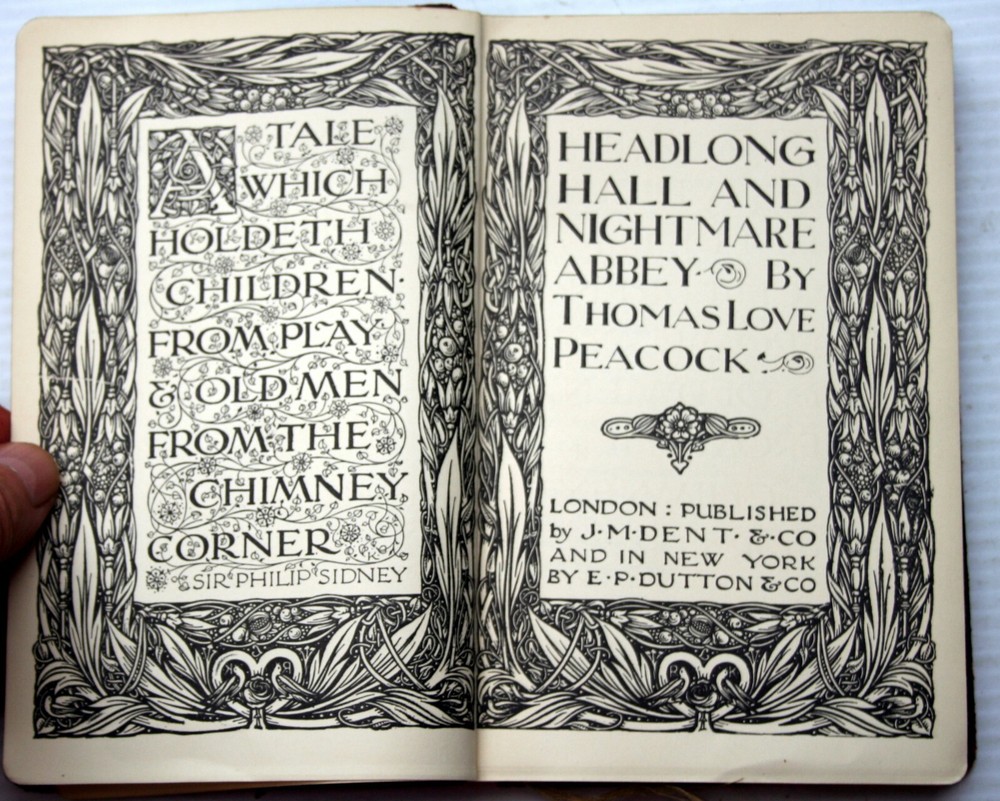 Assumed first printing (thus) no additional printings noted. The series was launched in 1906. Tight, clean leather book with real gold decorations and titling. Tips chipped and rubbed, top edge gilt. Marker ribbon tighly held in the text block. Edges worn, front board splitting at the corner. T hese two novels contain characters who are either representative types, or thinly veiled caricatures of Peacock's contemporaries, who gather in country houses to eat, drink and discuss. These tales poke fun at contemporary attitudes and ideas, such as the Romantic literary movement. .