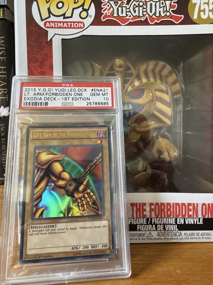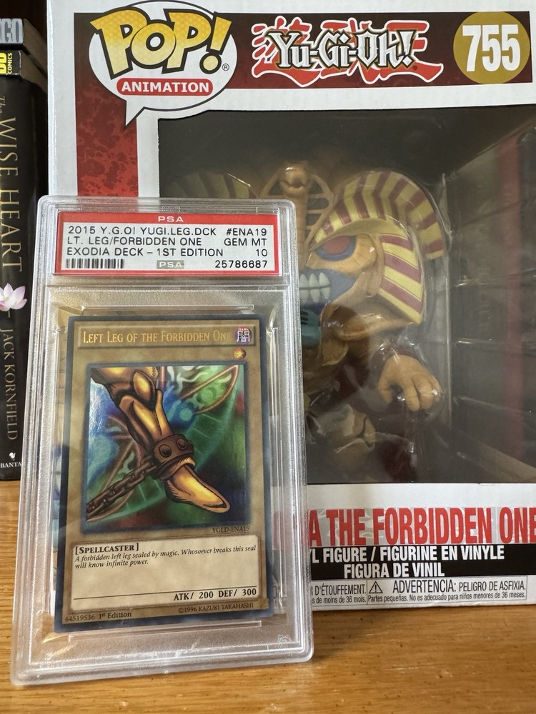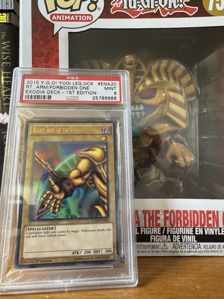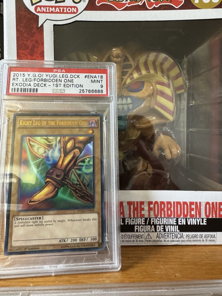 Sequential 3x PSA 10’s & 2x 9’s: PSA 10 - Left Arm of the Forbidden One - 25786685 PSA 9 - Right Arm of the Forbidden One - 25786686 PSA 10 - Left Leg of the Forbidden One - 25786687 PSA 9 - Right Leg of the Forbidden One - 25786688 PSA 10 - Exodia the Forbidden One - 25786689 Oversized POP Exodia Figure: - Box has two small cuts/tears on the sides This set is all 1st Editions for the Yugi’s Legendary Decks and was graded that year. They were graded sequentially and not pieced together from other sets.