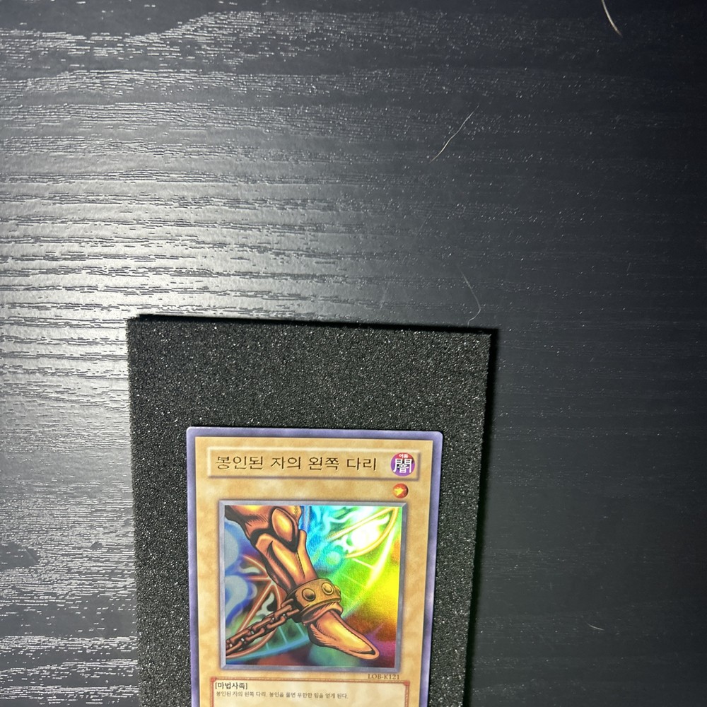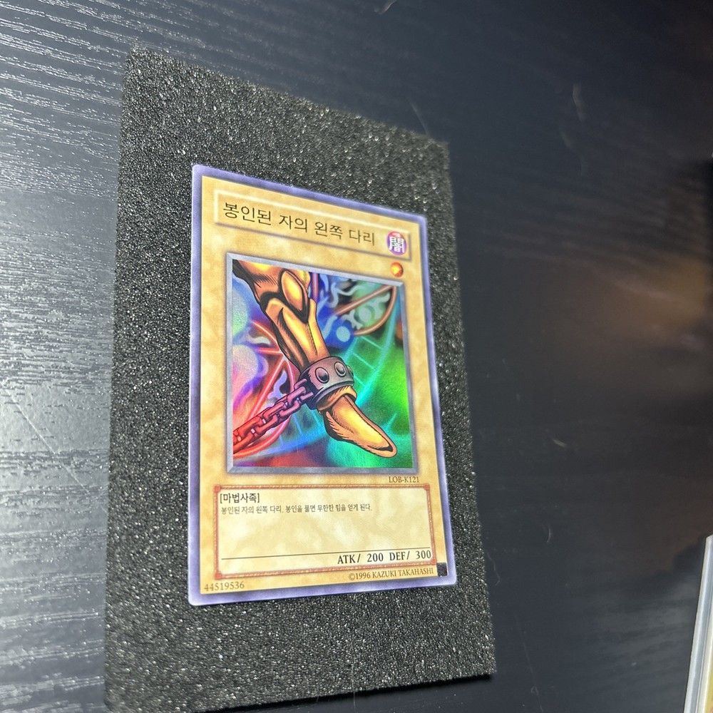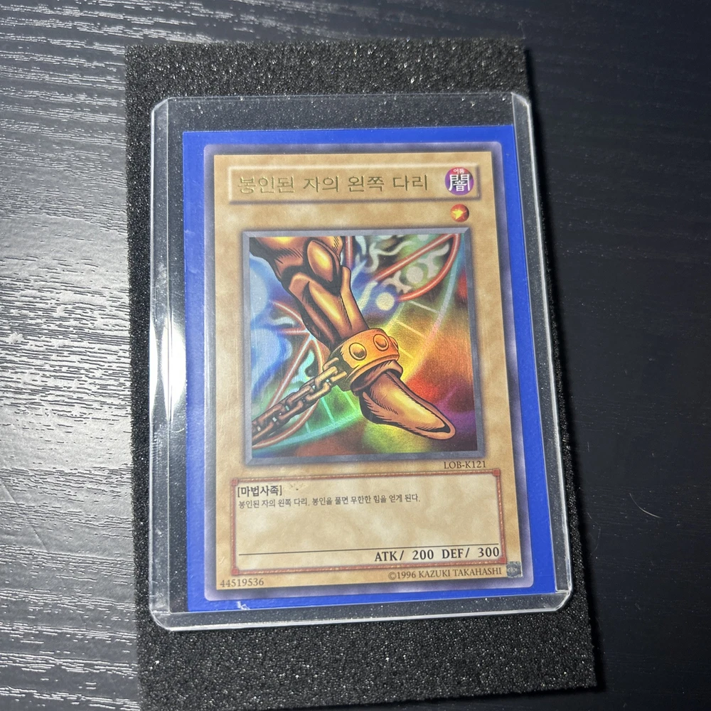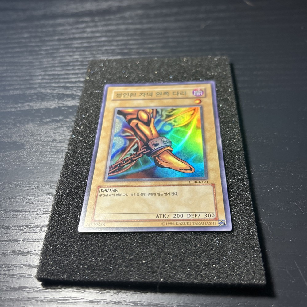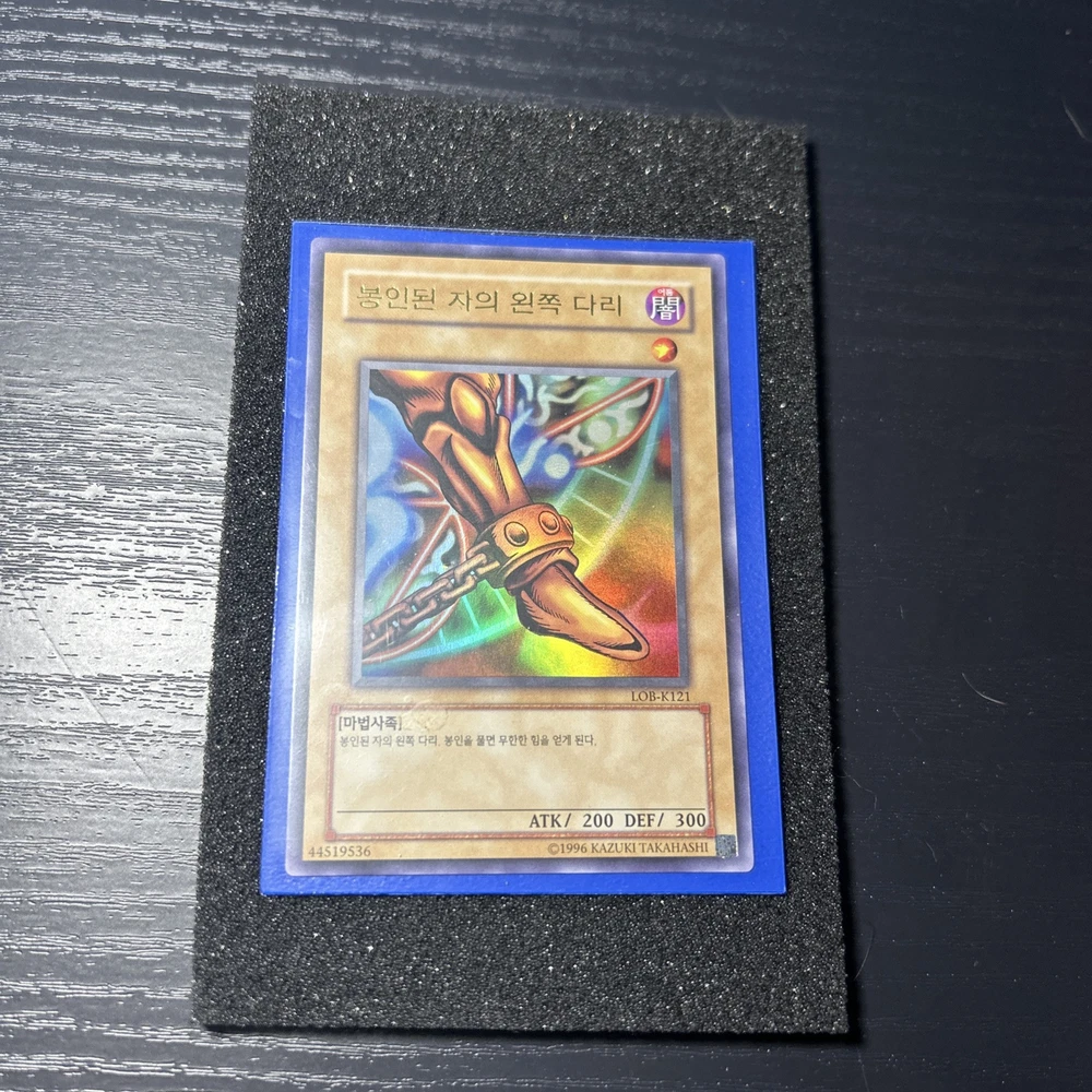 This is an Ultra Rare Korean version of the Yu-Gi-Oh! TCG card "Left Leg of the Forbidden One" from the Legend of Blue Eyes White Dragon set. Manufactured by Konami in 2003, this foil card is in near mint or better condition. It features Exodia, specifically the left leg, and is made of card stock. The card number is LOB-K121 and it is suitable for ages 4 and up.