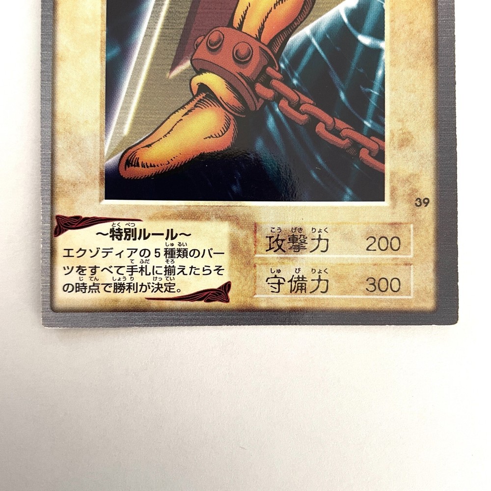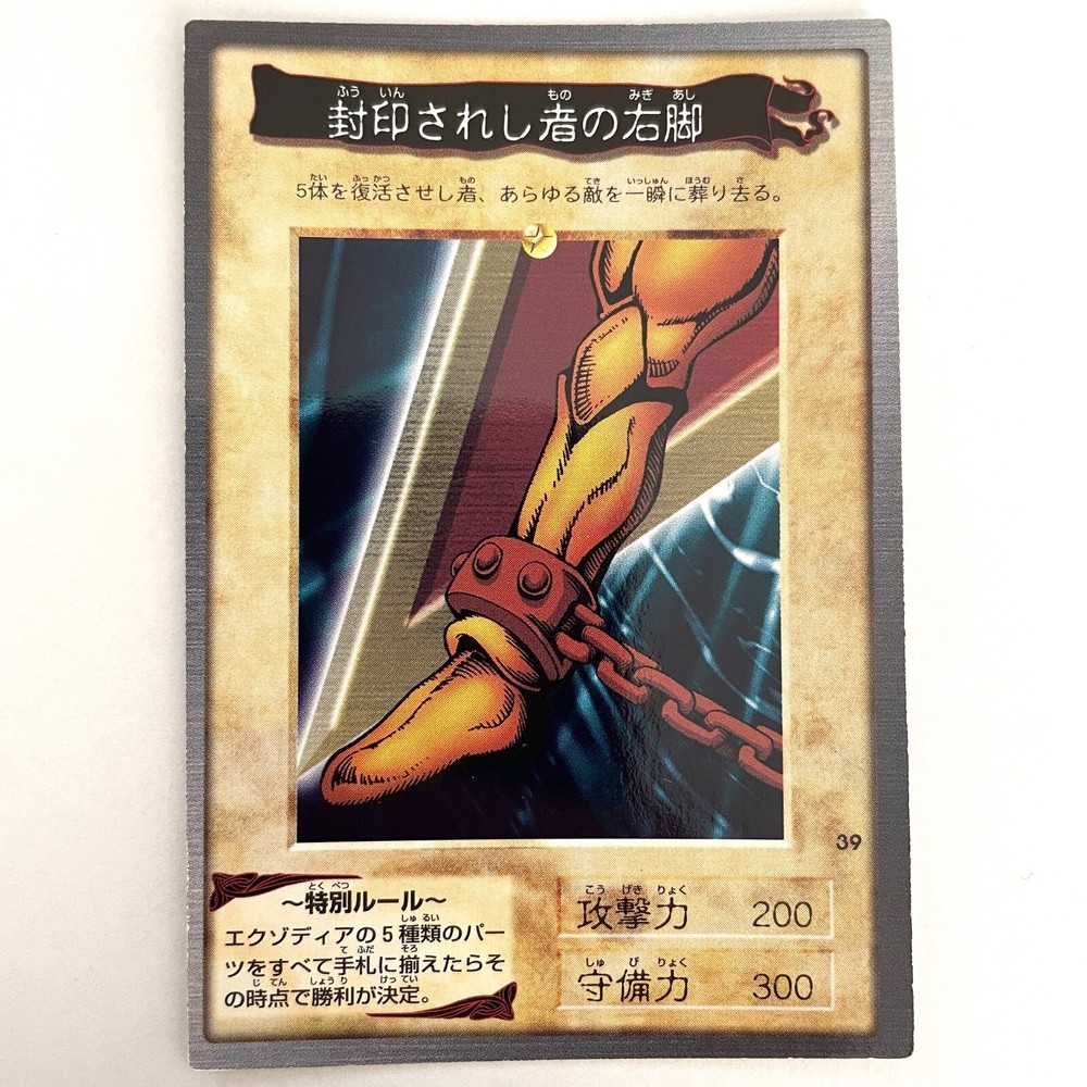 Description Right Leg of the Forbidden One No.39 Japanese YuGiOh Bandai Carddass - HP Condition : Excellent Condition - As a Trading Cards collector myself, I can check the condition exactly. 【NM】Near Mint (4/4): Display minimal or no wear or damage. All surfaces and edges are pristine and appear “fresh out of the pack. 【EX】Excellent (3/4): Have slight corner and edge wear along with minor scratches on the surface, but no other flaws. 【MP】Moderately Played (2/4): Have discernible flaws such as border and corner wear, noticeable scratches and creases, slight bends, notching, layering, and moderate discoloration or whitening. 【HP】Heavily Played (1/4): Show a massive amount of wear and damage. Corners and edges will be rounded, chipped, or fuzzy, and there will be major discoloration, layering, notching, creasing, and scratches. - I follow “eBay card conditions and guidelines”. - Click here for details : https://pages.ebay.com/cardconditions/ Shipping Economy Shipping Japan Post Air Mail : takes about 1~2 weeks, +Handing time No tracking. Standard Shipping Japan Post Air Mail : takes about 1~2 weeks, +Handing time With tracking. Expedited Shipping FedEx or EMS : takes about 1~4 days, +Handing time With tracking. - Use a loader, waterproof pack, and put it in a cushioned envelope. - You can save shipping fees when you buy multiple items. No charge shipping fees for additional items. International Buyers - Please Note: Import duties, taxes and charges are not included in the item price or shipping charges. These charges are the buyer's responsibility. Please check with your country's customs office to determine what these additional costs will be prior to bidding/buying. These charges are normally collected by the delivering freight(shipping) company or when you pick the item up -do not confuse them for additional shipping charges. We do not mark merchandise values below value or mark item as "gift" -US and international government regulations prohibit such behavior.