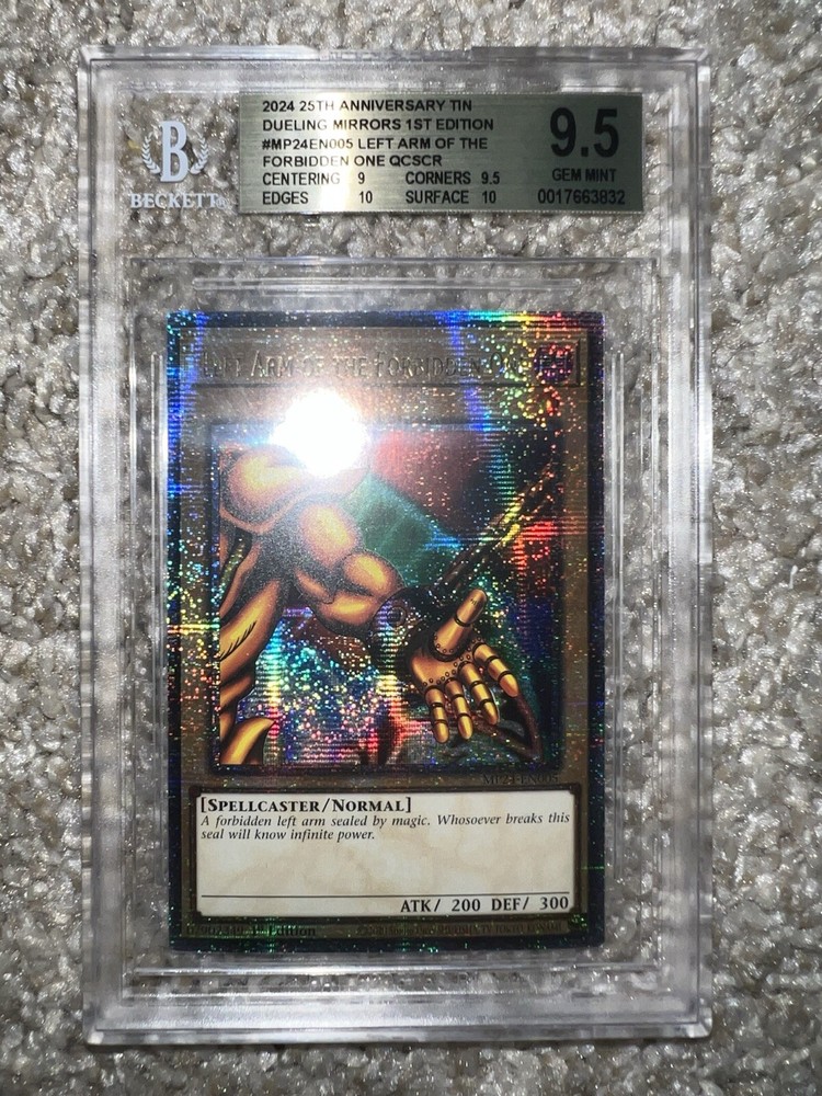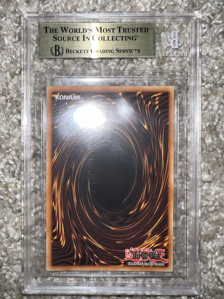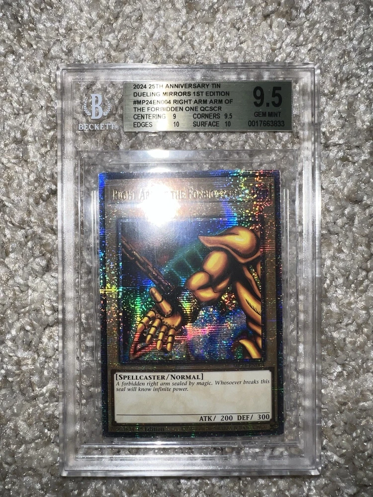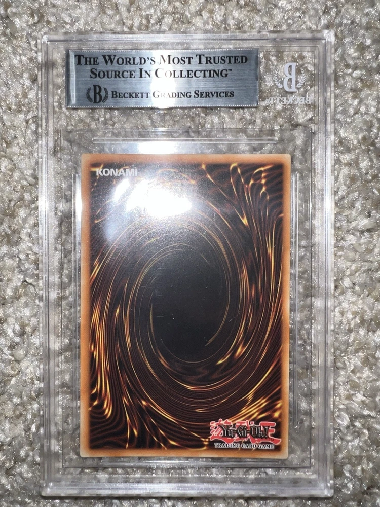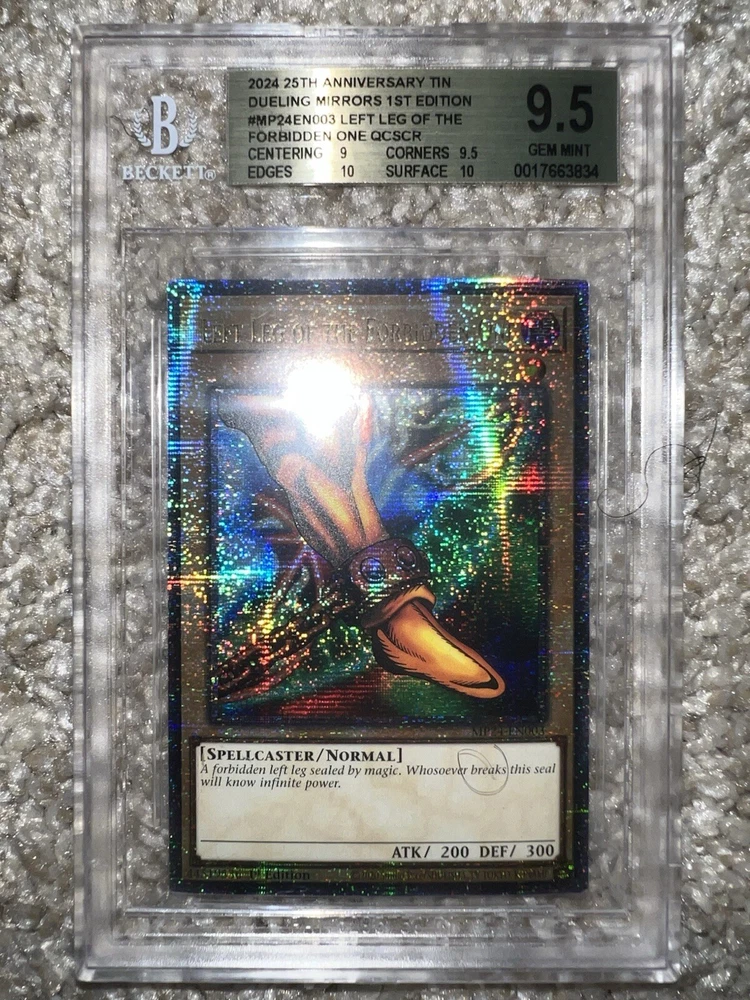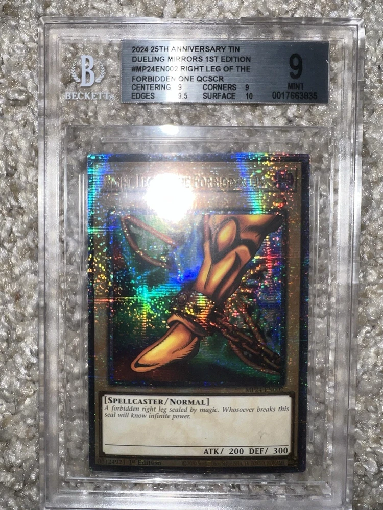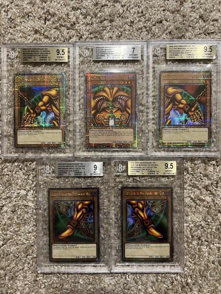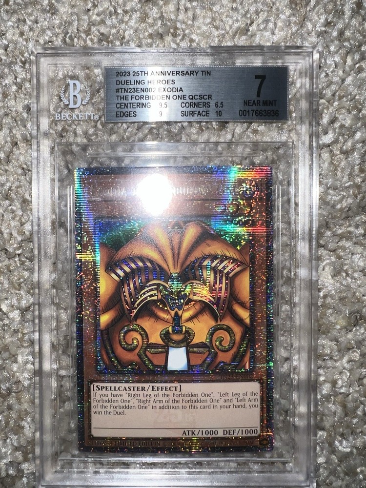 Exodia The Forbidden One card collection from the 25th Anniversary Tin features the Dark Spellcaster monster in a Limited Edition 1st Edition release. Manufactured by Konami in 2023 & 2024, these Ultra Rare Yu-Gi-Oh! TCG cards are professionally graded as 7 - 9.5 by Beckett Collectors Club Grading (BCCG). It has a Holo finish and is part of the Dueling Heroes Collection.