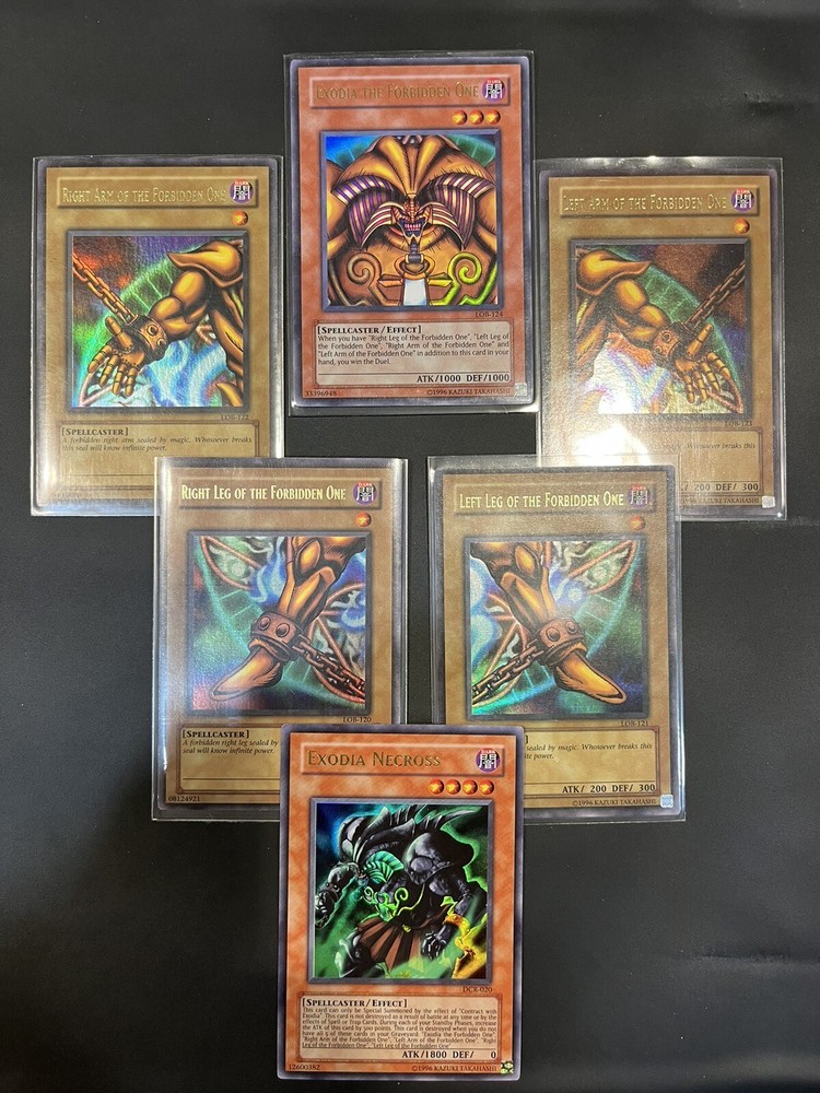 Complete Set of Exodia First Print (2002) ultra Rare Exodia the forbidden one left arm right arm left leg and right leg / (2010) Second Print Head of the forbidden one Legend of blue eyes set and a first Print of ultra Rare Exodia Necross From Dcr