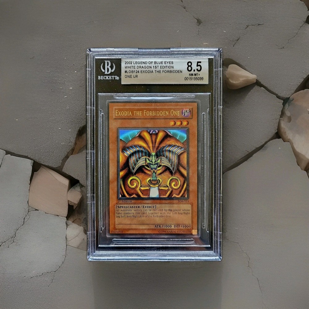 Dive into the world of Yu-Gi-Oh! TCG with the iconic Exodia the Forbidden One card from the Legend of Blue Eyes White Dragon set. Graced with an Ultra Rare status and the allure of a 1st Edition, this spellcaster card, numbered LOB-124, boasts an impressive 8.5 grade from Beckett Grading Services, ensuring its prestige and quality. Crafted in 2002, this English language card is a piece of Yu-Gi-Oh! history, featuring the enigmatic Yugi Muto and rendered in a striking Holo finish. As a vintage collectible manufactured in the United States, it's a must-have for enthusiasts and comes in the standard Japanese card size, making it a perfect fit for any collection.