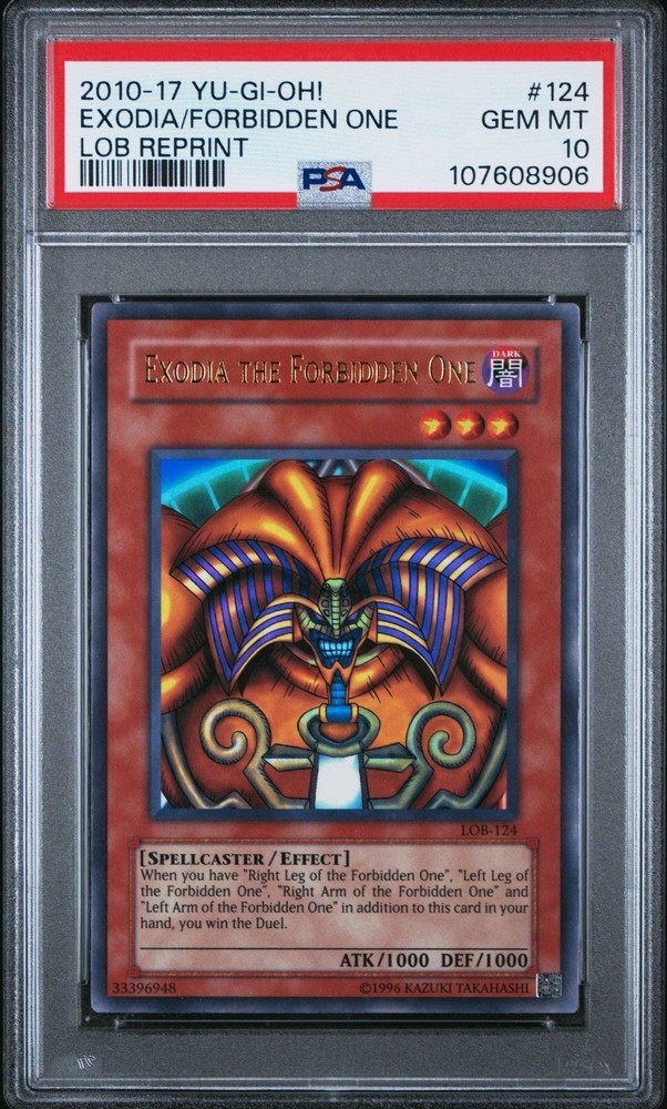 The product is a PSA 10 graded Exodia The Forbidden One card from the Yu-Gi-Oh! TCG collection. This vintage card features the Dark attribute, is a Spellcaster creature with 1000 attack and defense powers, and is in English language with a Holo finish. As a highly sought-after collectible, this Ultimate stage card is a valuable addition to any card game collection.