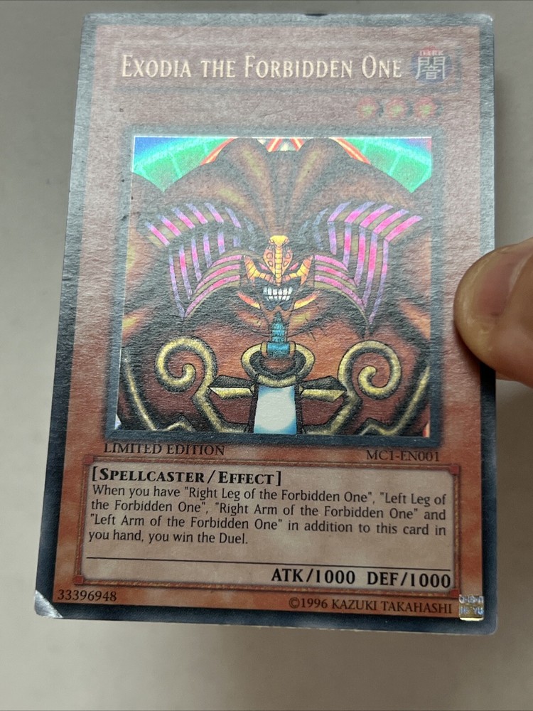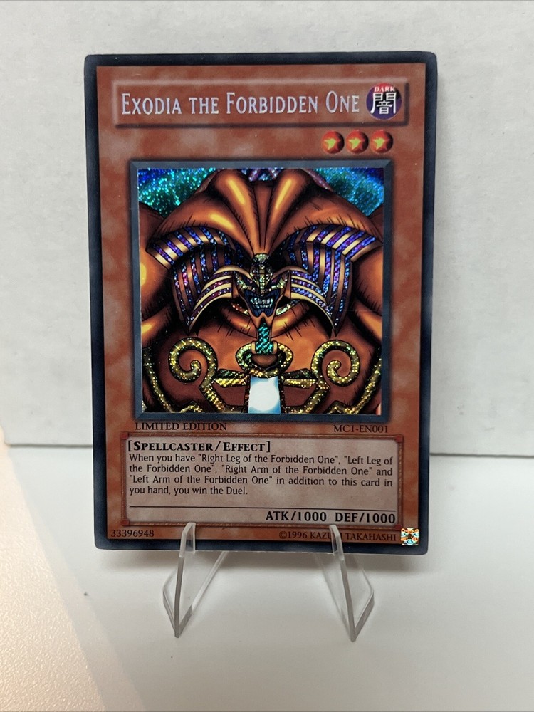 Exodia The Forbidden One MC1-EN001 is a limited edition secret rare card from the Yu-Gi-Oh! TCG Master Collection Volume 1. It features Yugi Muto and has an effect type attribute. The card is manufactured by Konami and has a holographic finish.