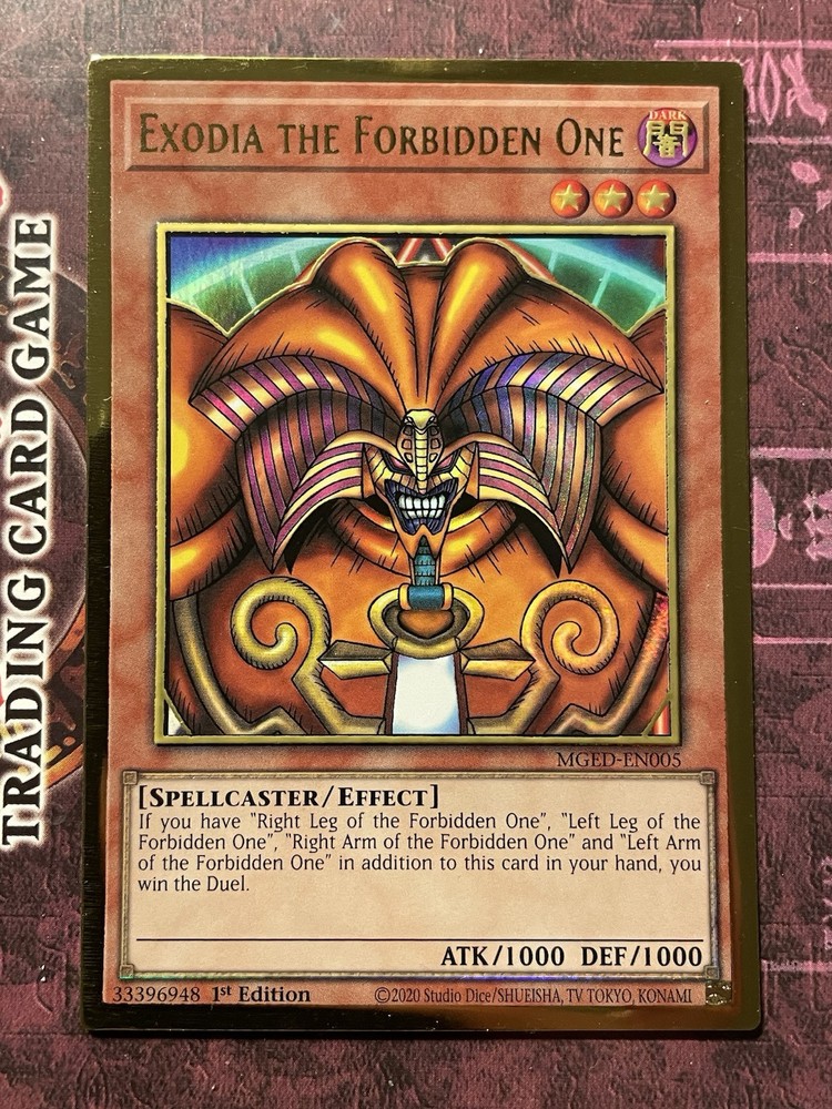 1x Exodia The Forbidden One (MGED-EN005) Gold Rare 1st Edition. Condition is near mint. Shipped with USPS. Fast shipping and will be sent in a top loader. Thank you!